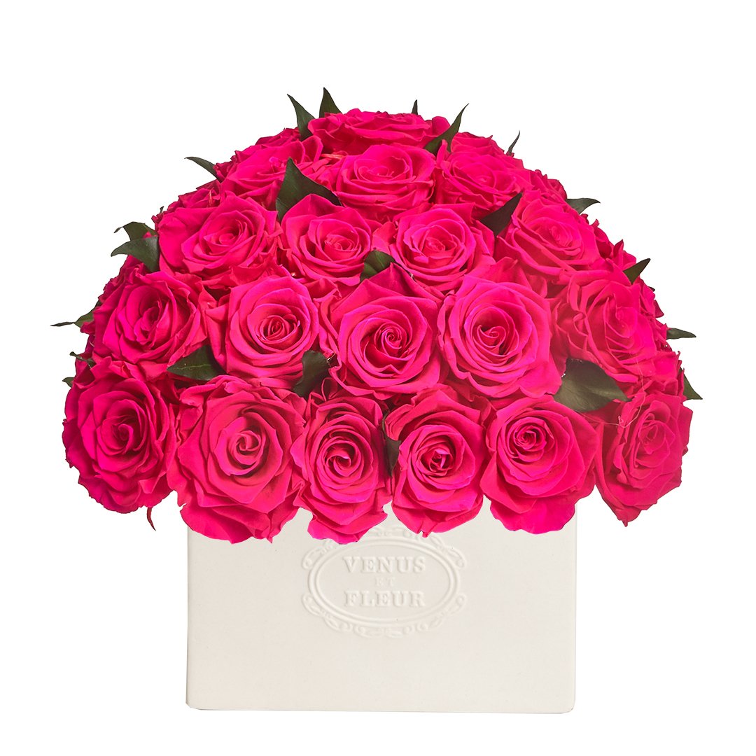 Adorned with luscious roses and vibrant greens, the small and classic Allura Vase is perfect for adding some romantic charm to the ambience of any room. Every arrangement is meticulously arranged by our skilled floral designer into our exclusive handcrafted porcelain vases. Some variations may occur.