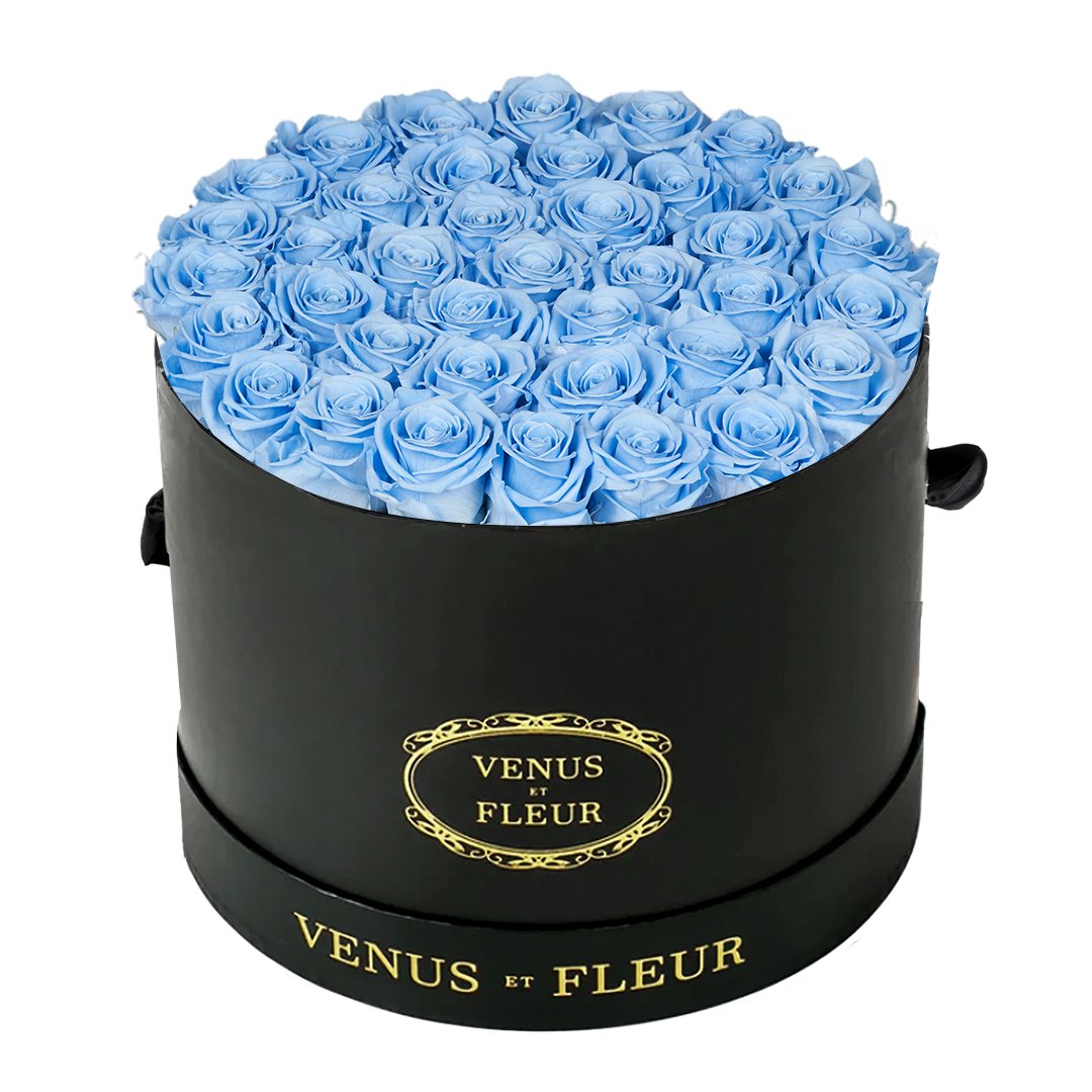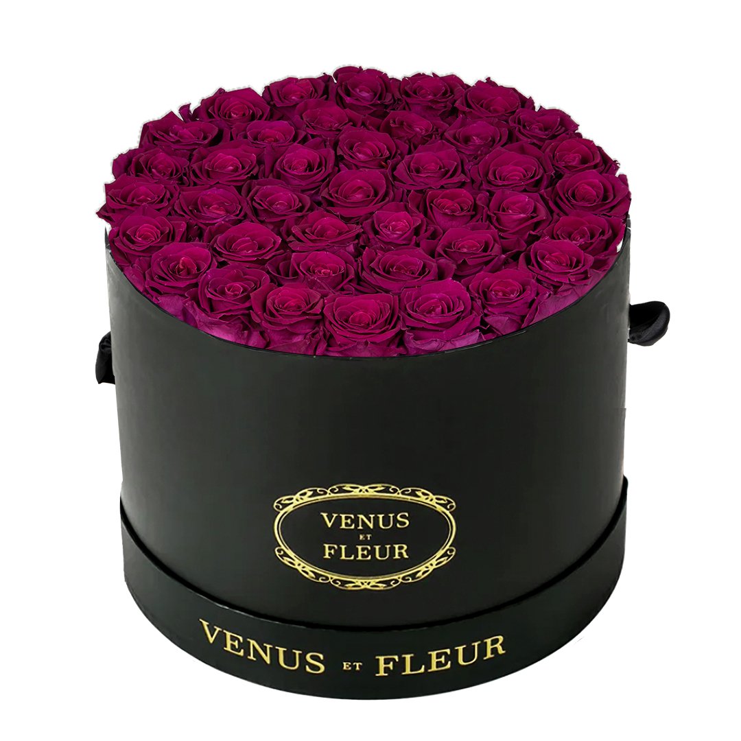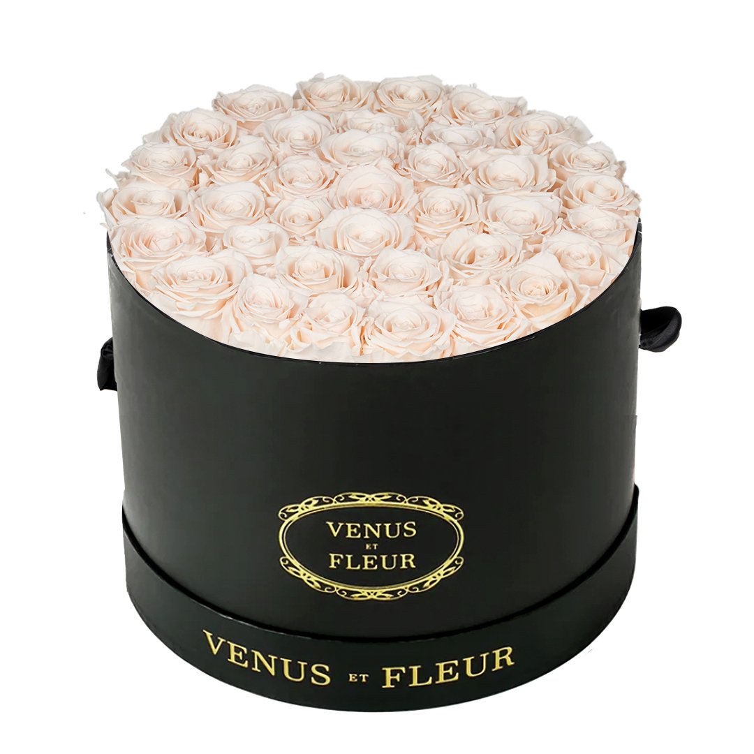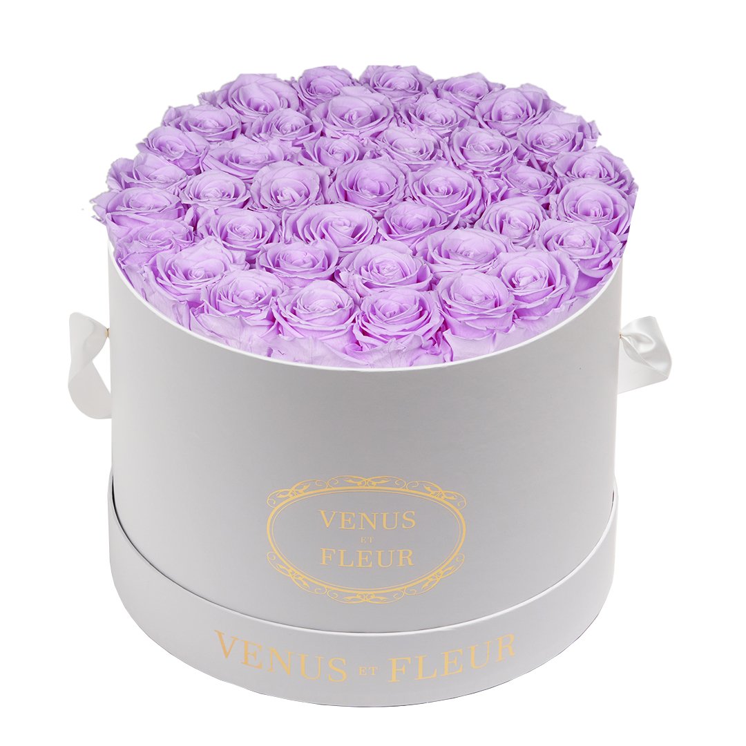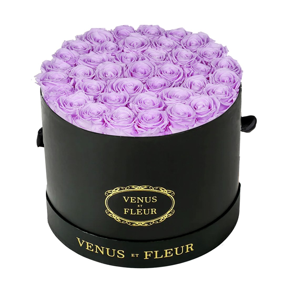 Our luxurious Large Round arrangements are comprised of 39-52 gorgeous Eternity Roses set in Parisian hat box-inspired vases. The classic arrangements will elevate any space with grace and majesty.