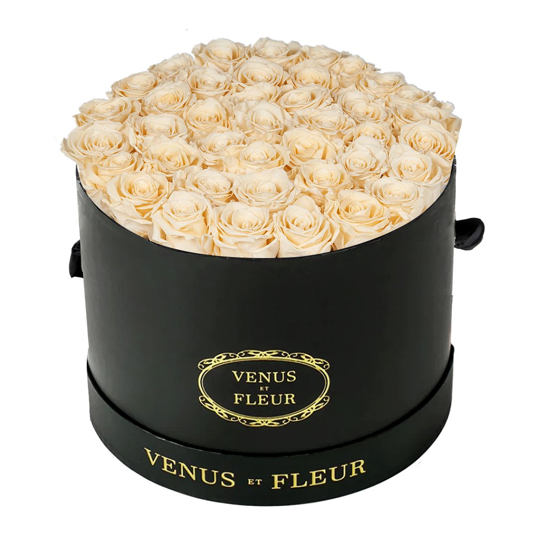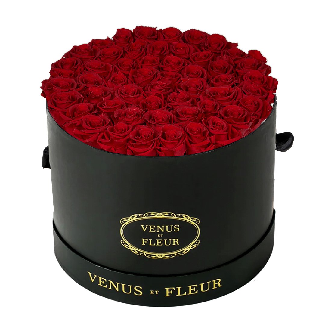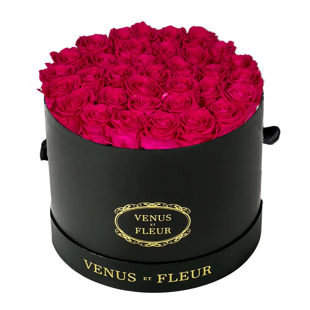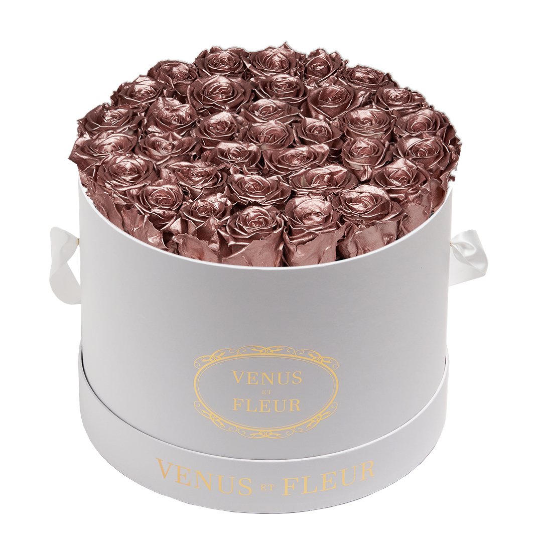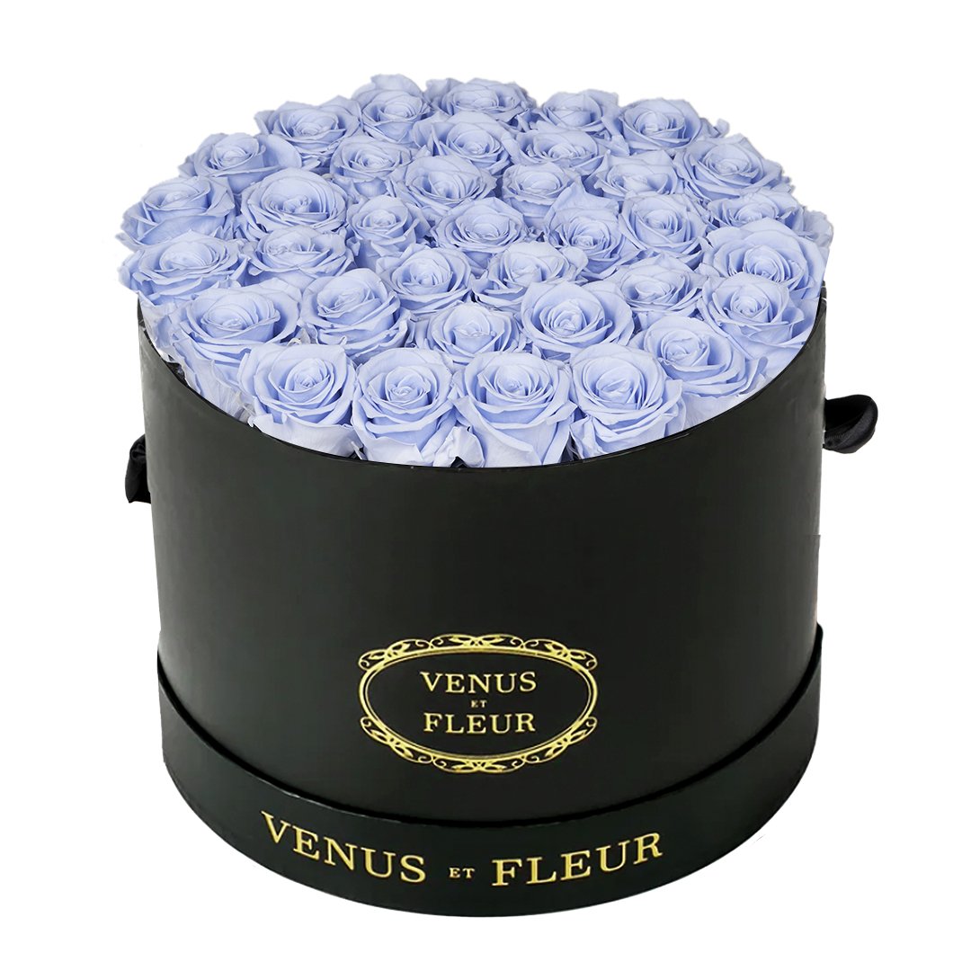 Our luxurious Large Round arrangements are comprised of 39-52 gorgeous Eternity Roses set in Parisian hat box-inspired vases. The classic arrangements will elevate any space with grace and majesty.
