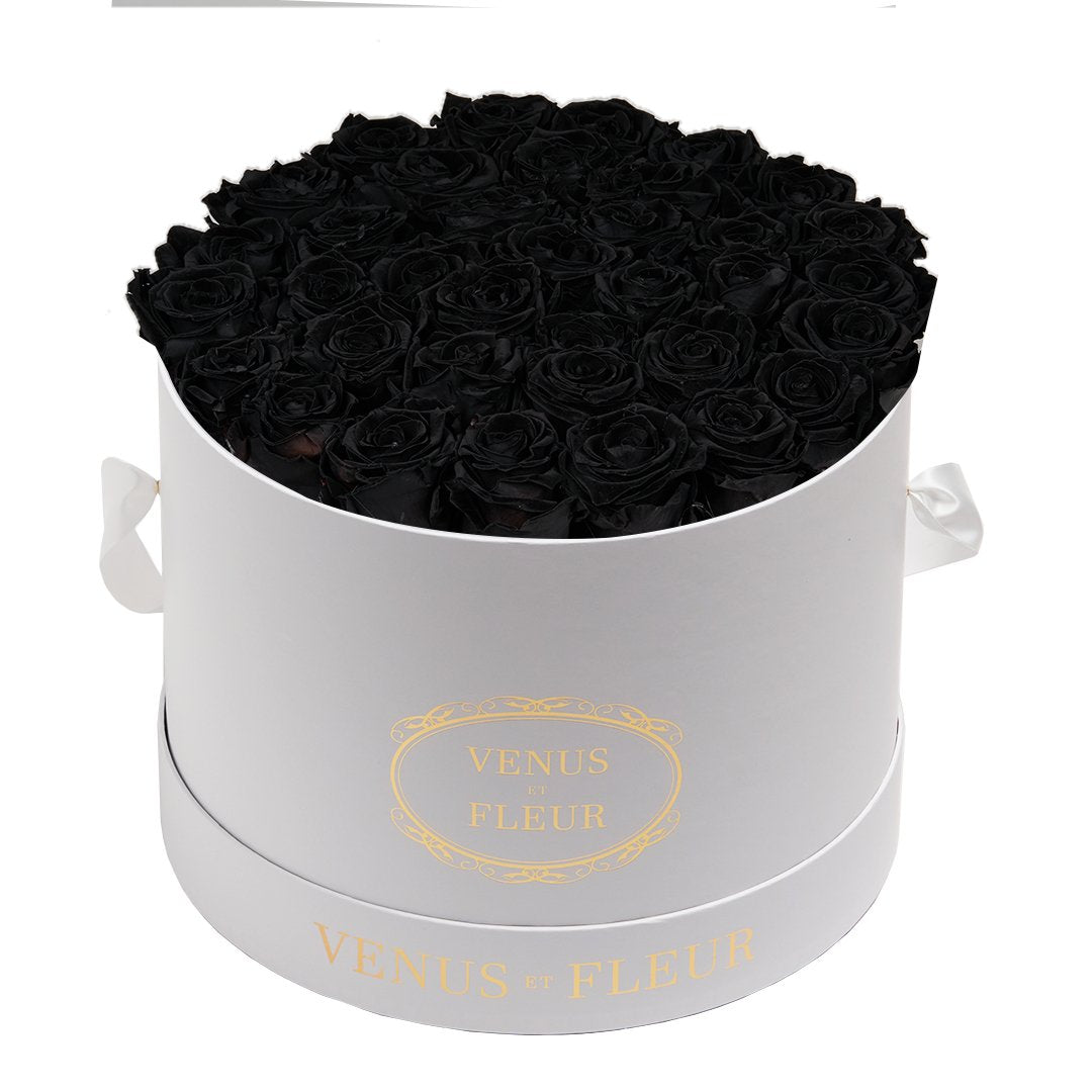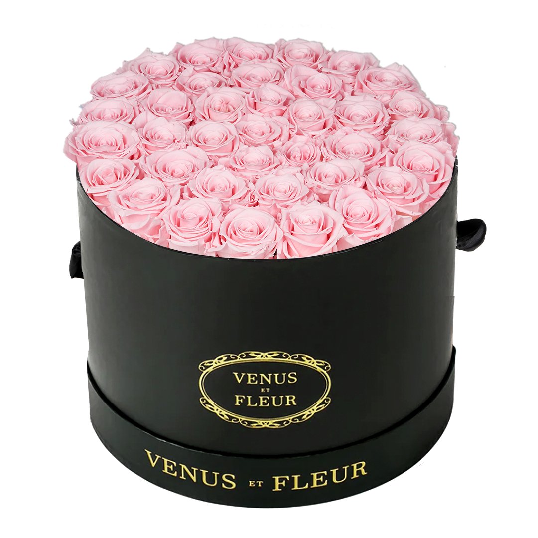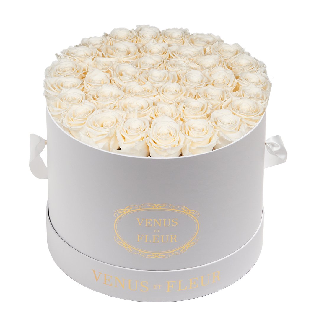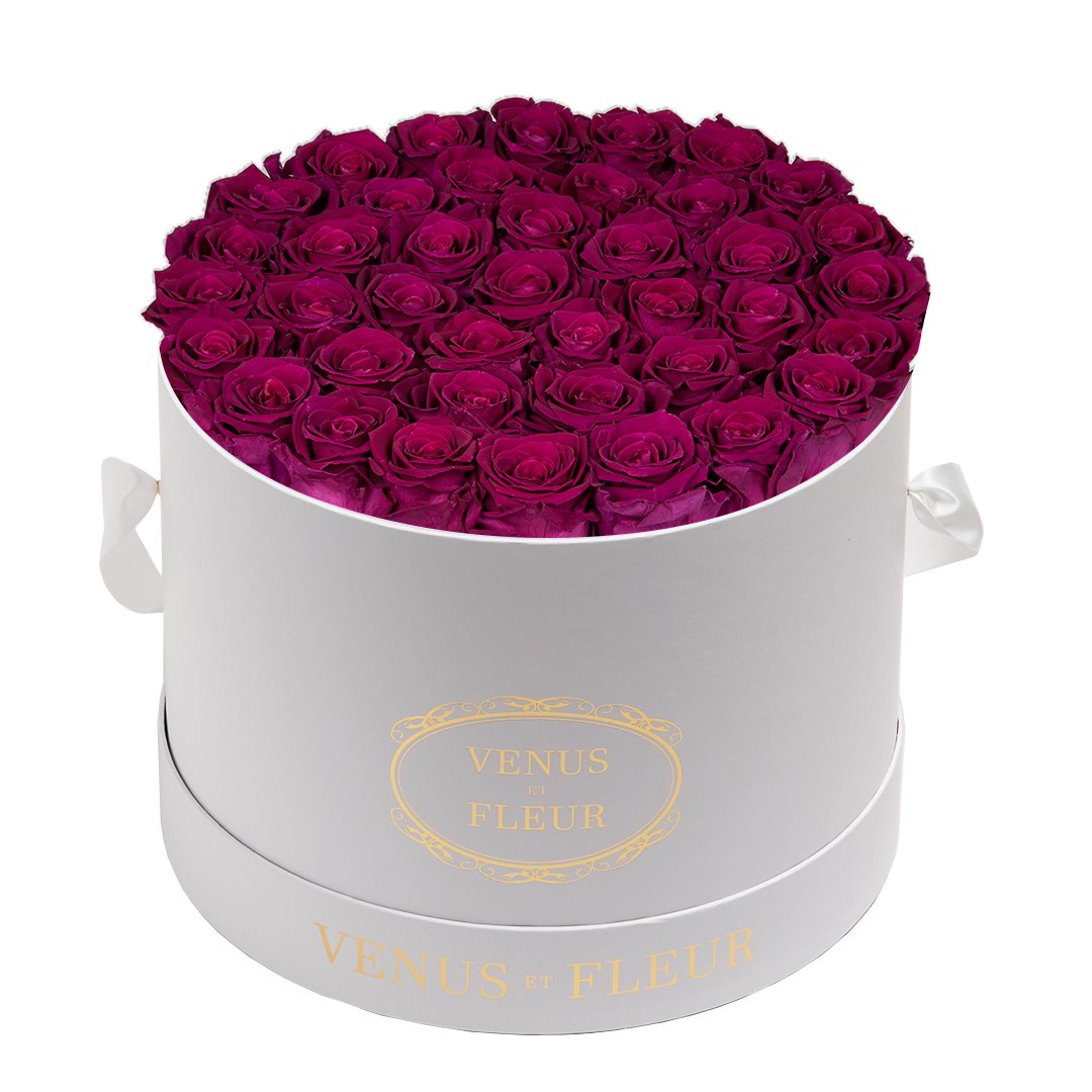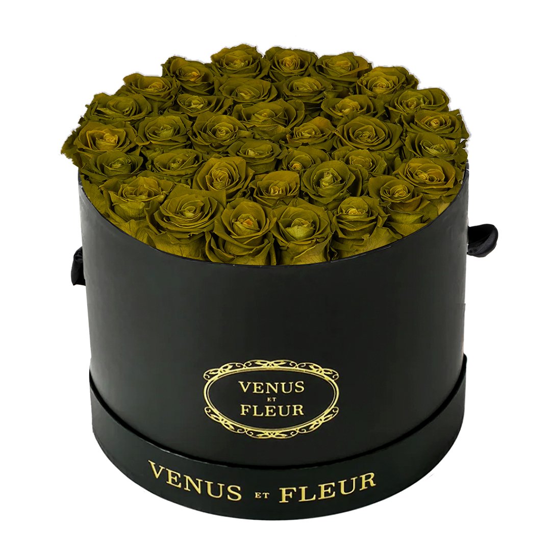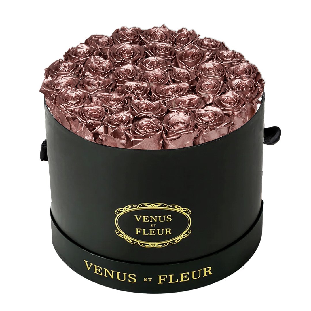 Our luxurious Large Round arrangements are comprised of 39-52 gorgeous Eternity Roses set in Parisian hat box-inspired vases. The classic arrangements will elevate any space with grace and majesty.