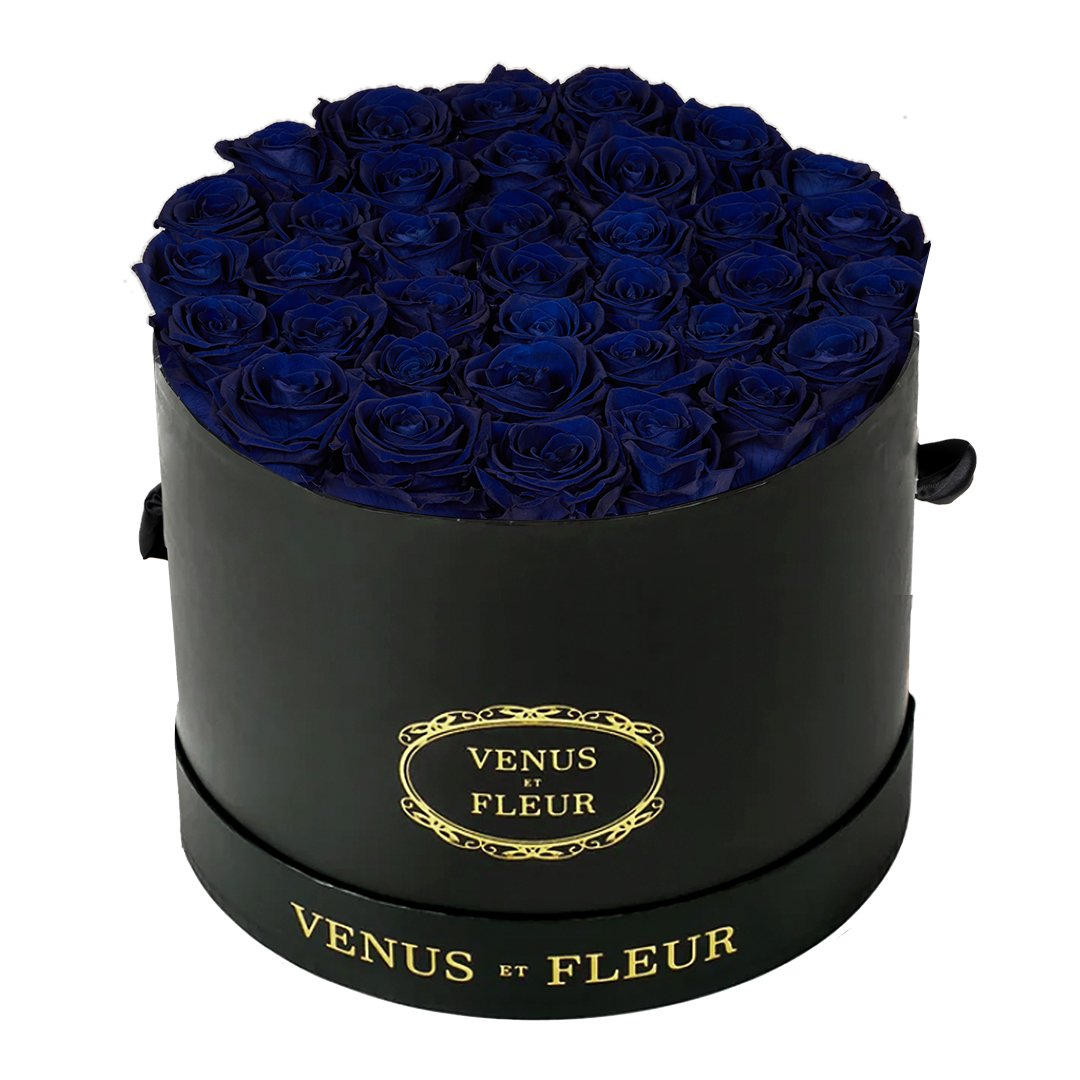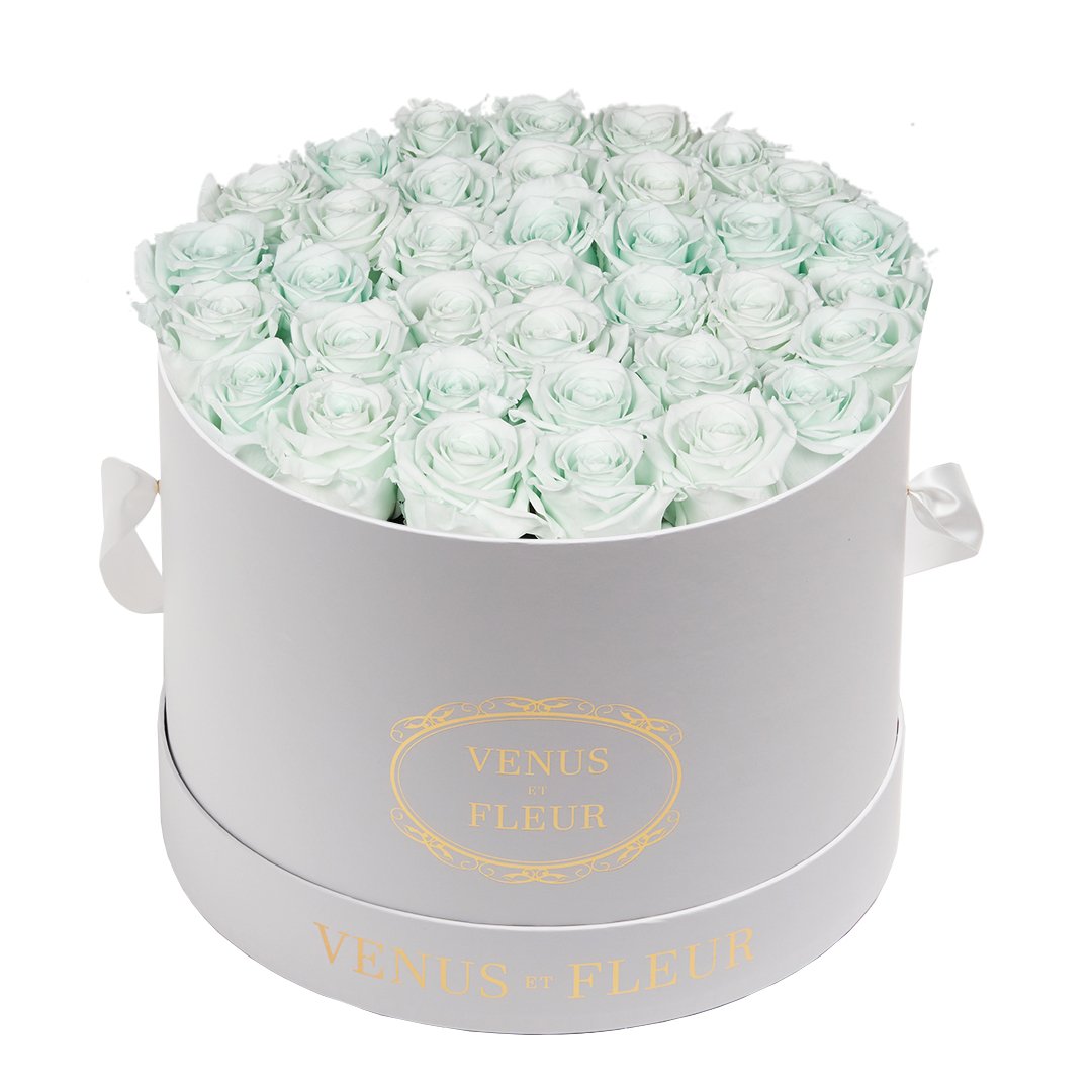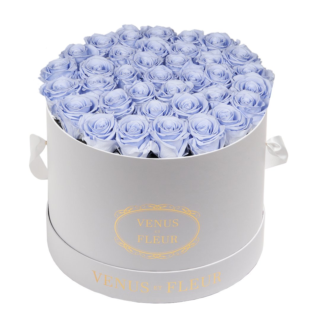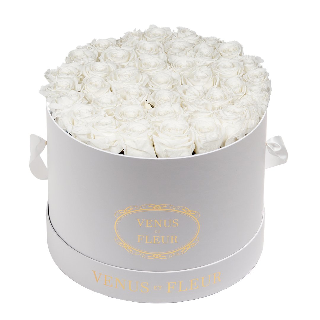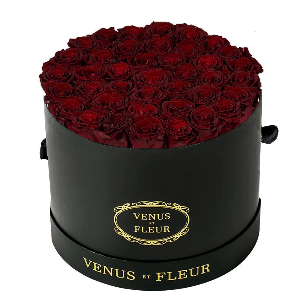 Our luxurious Large Round arrangements are comprised of 39-52 gorgeous Eternity Roses set in Parisian hat box-inspired vases. The classic arrangements will elevate any space with grace and majesty.