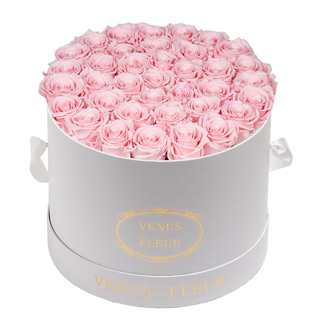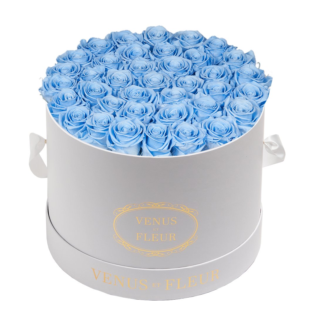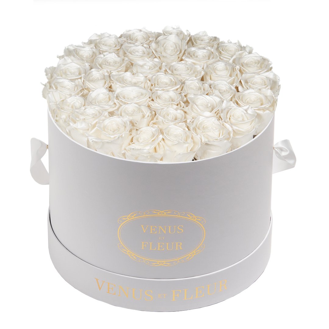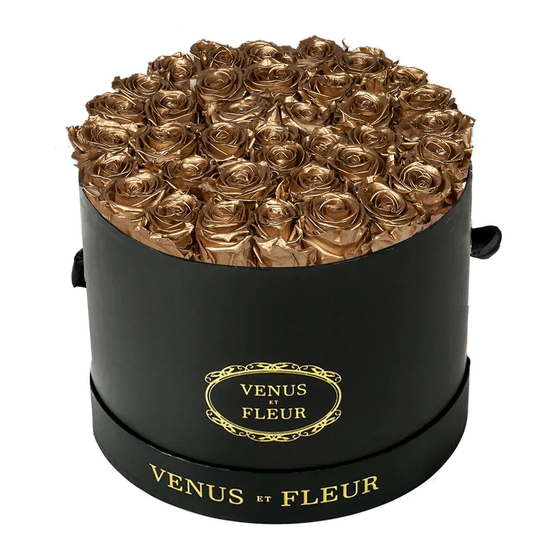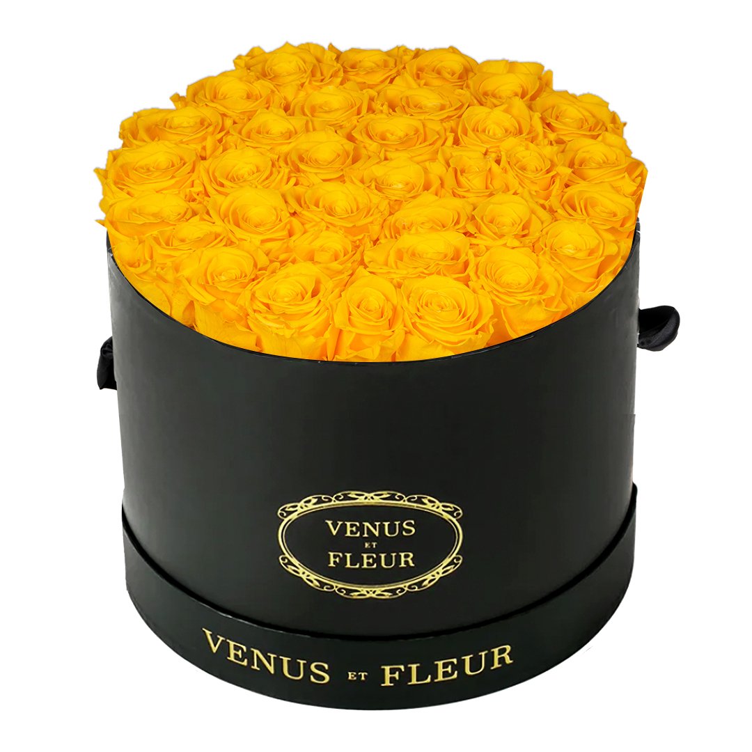 Our luxurious Large Round arrangements are comprised of 39-52 gorgeous Eternity Roses set in Parisian hat box-inspired vases. The classic arrangements will elevate any space with grace and majesty.