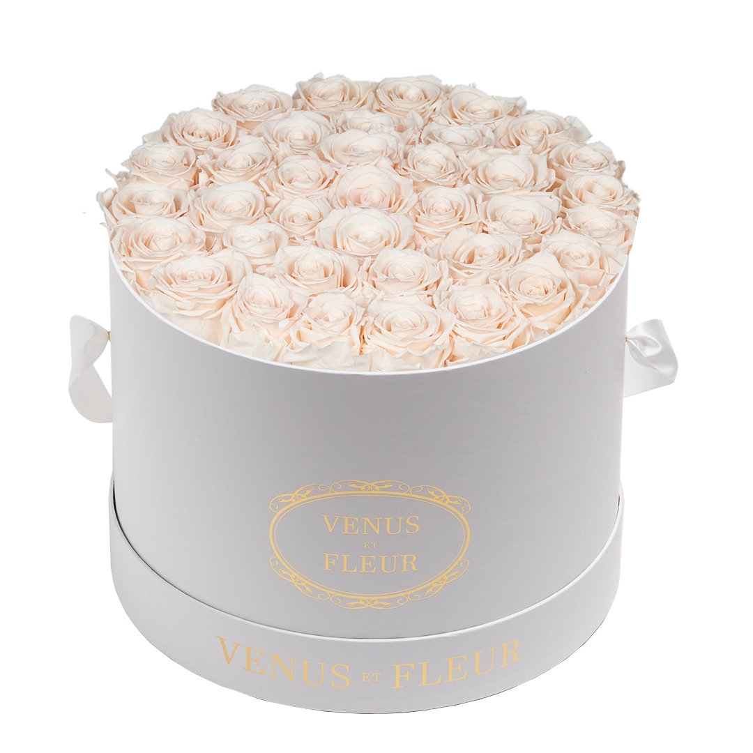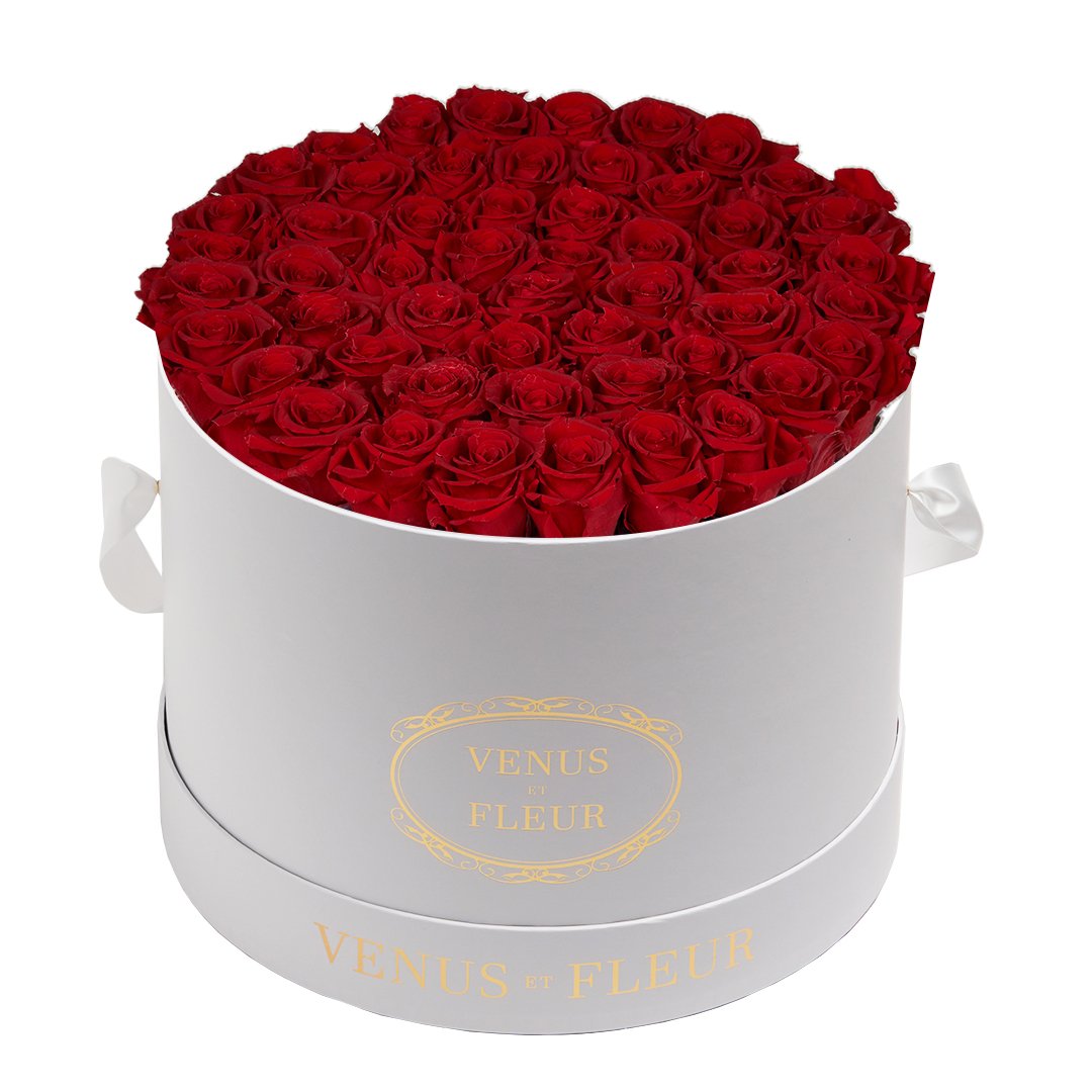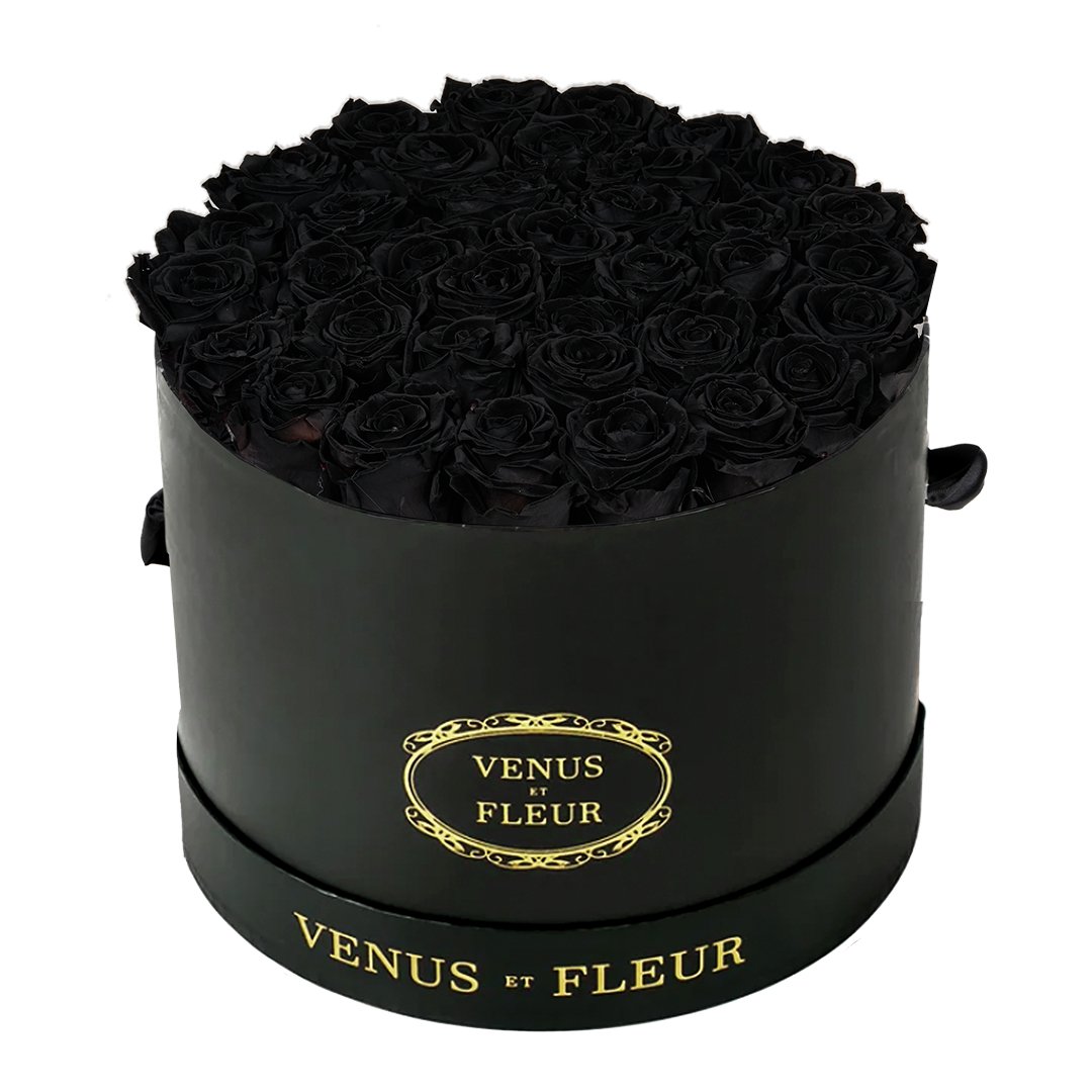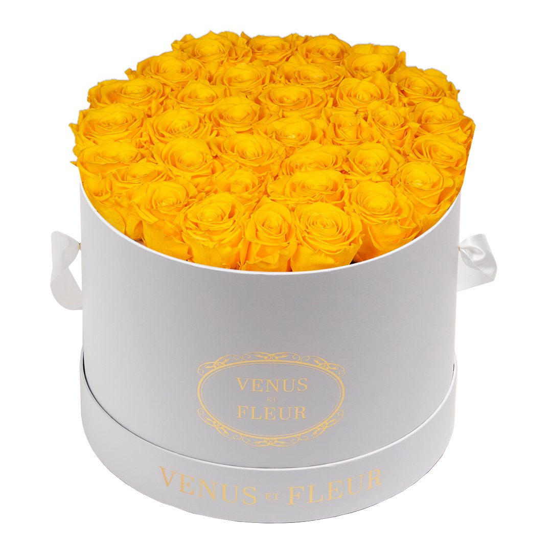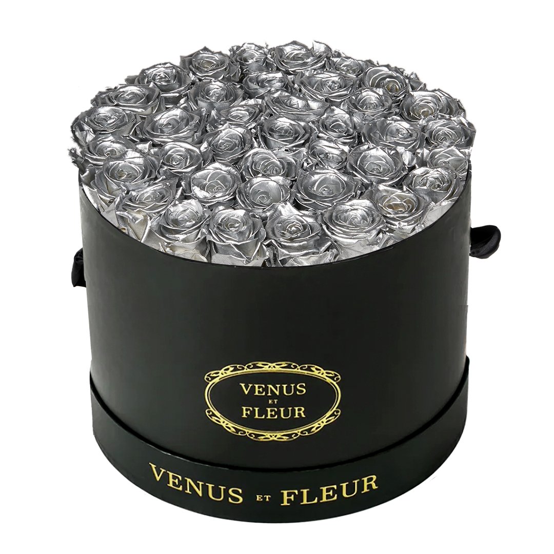 Our luxurious Large Round arrangements are comprised of 39-52 gorgeous Eternity Roses set in Parisian hat box-inspired vases. The classic arrangements will elevate any space with grace and majesty.