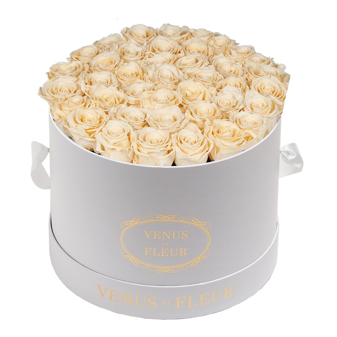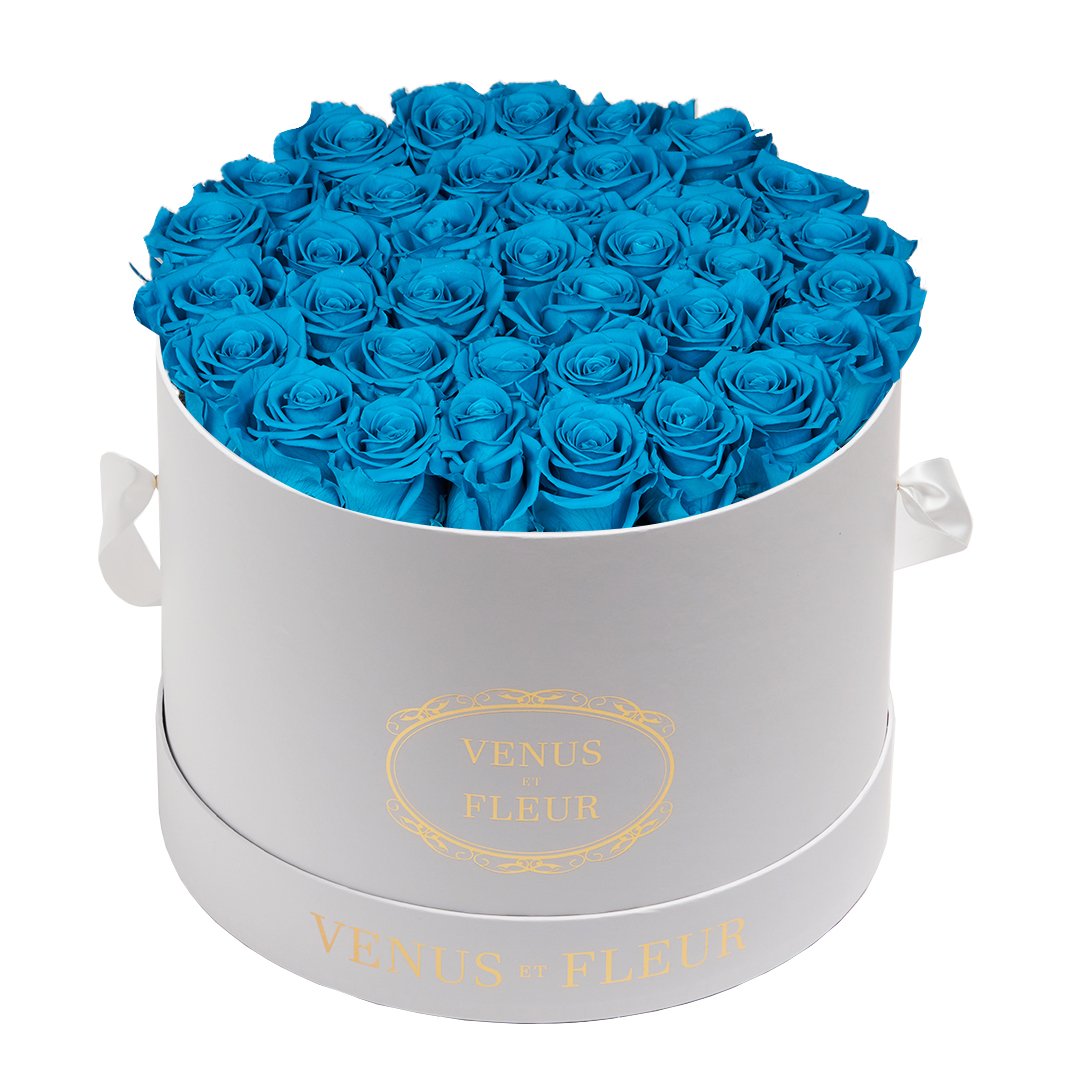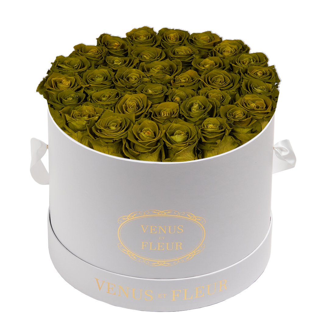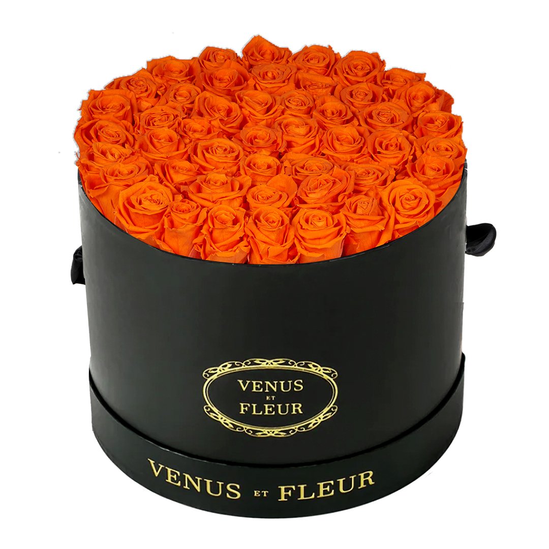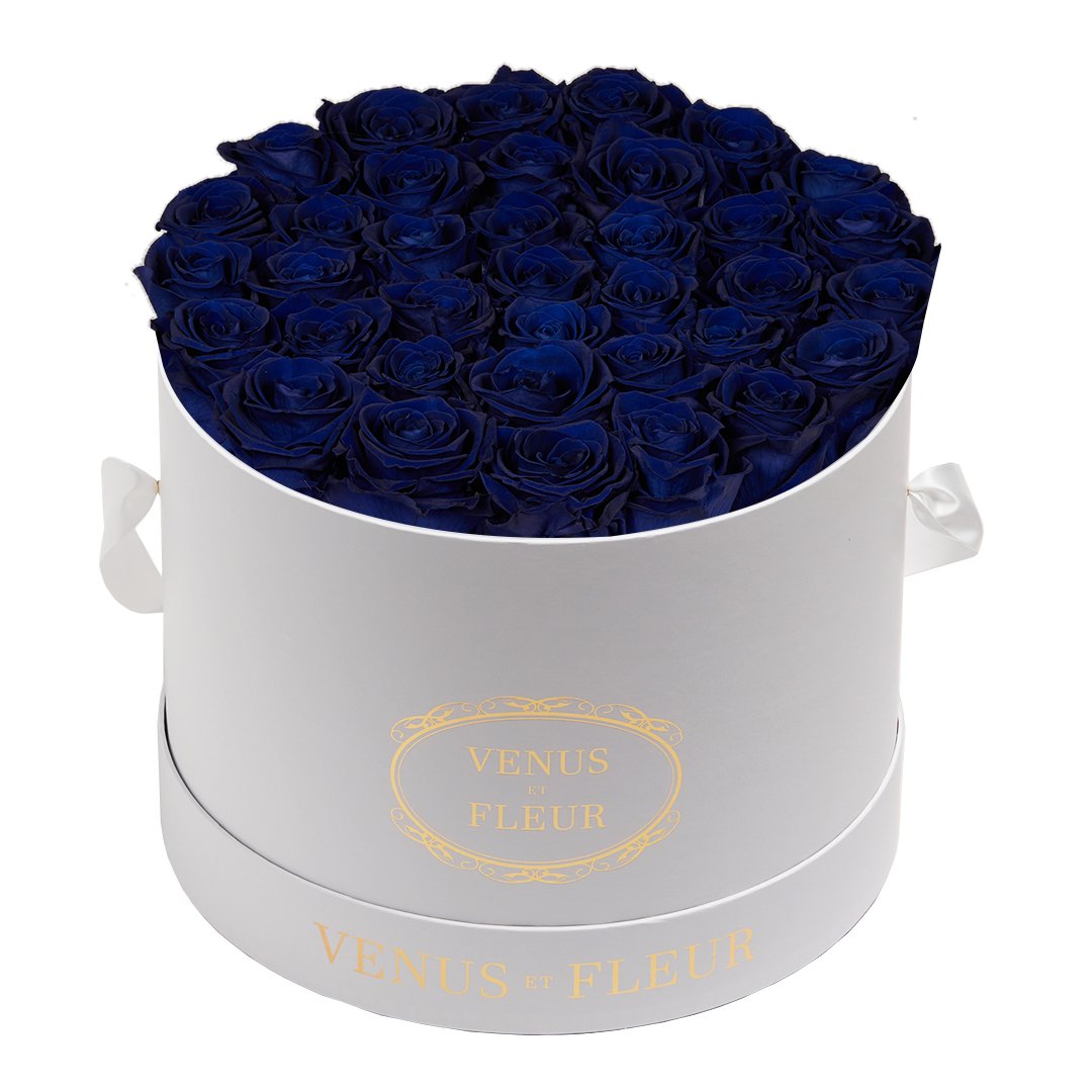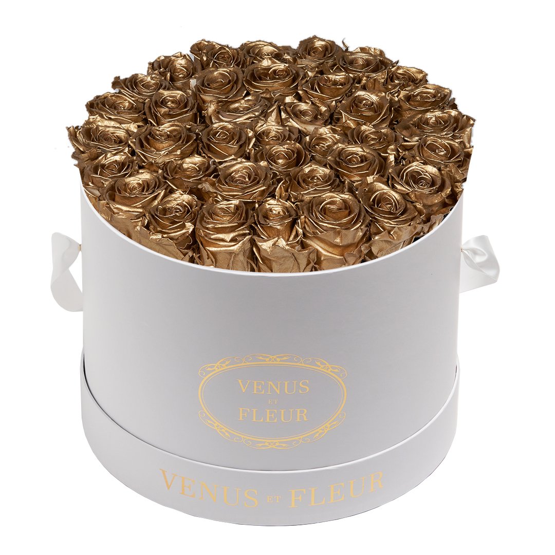 Our luxurious Large Round arrangements are comprised of 39-52 gorgeous Eternity Roses set in Parisian hat box-inspired vases. The classic arrangements will elevate any space with grace and majesty.
