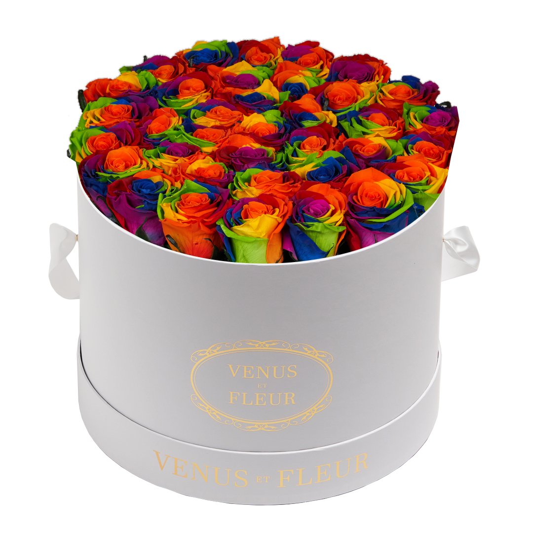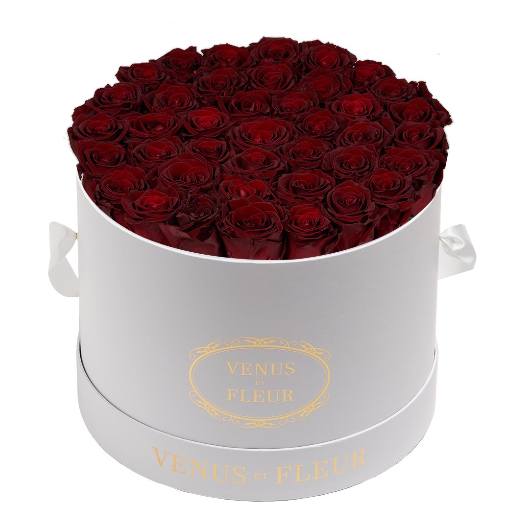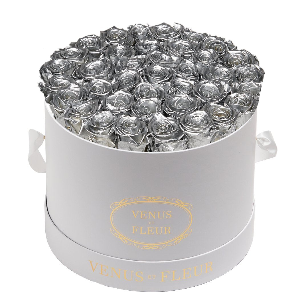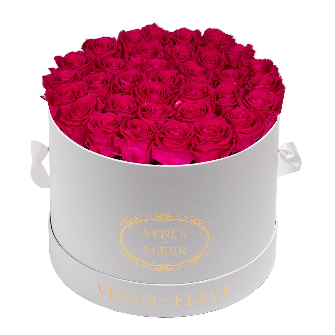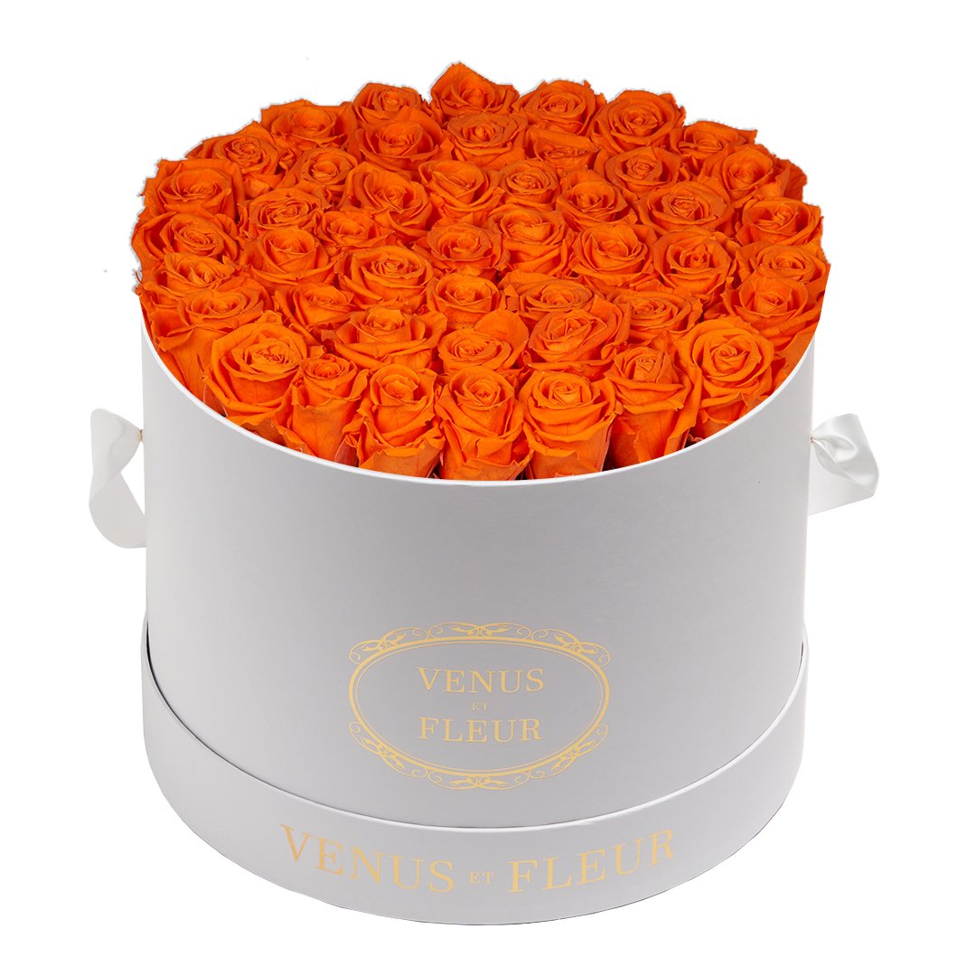 Our luxurious Large Round arrangements are comprised of 39-52 gorgeous Eternity Roses set in Parisian hat box-inspired vases. The classic arrangements will elevate any space with grace and majesty.