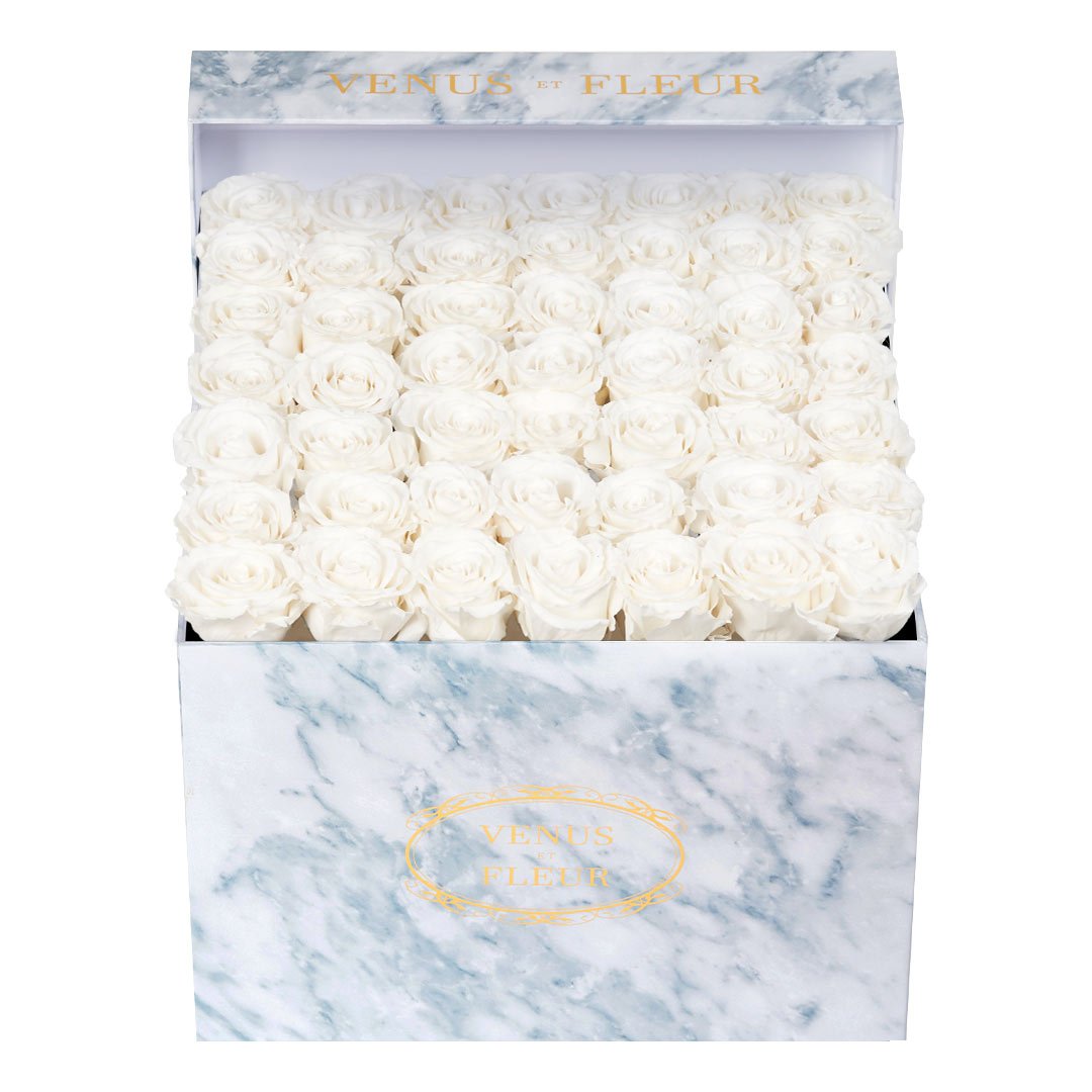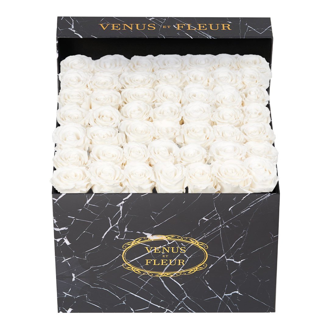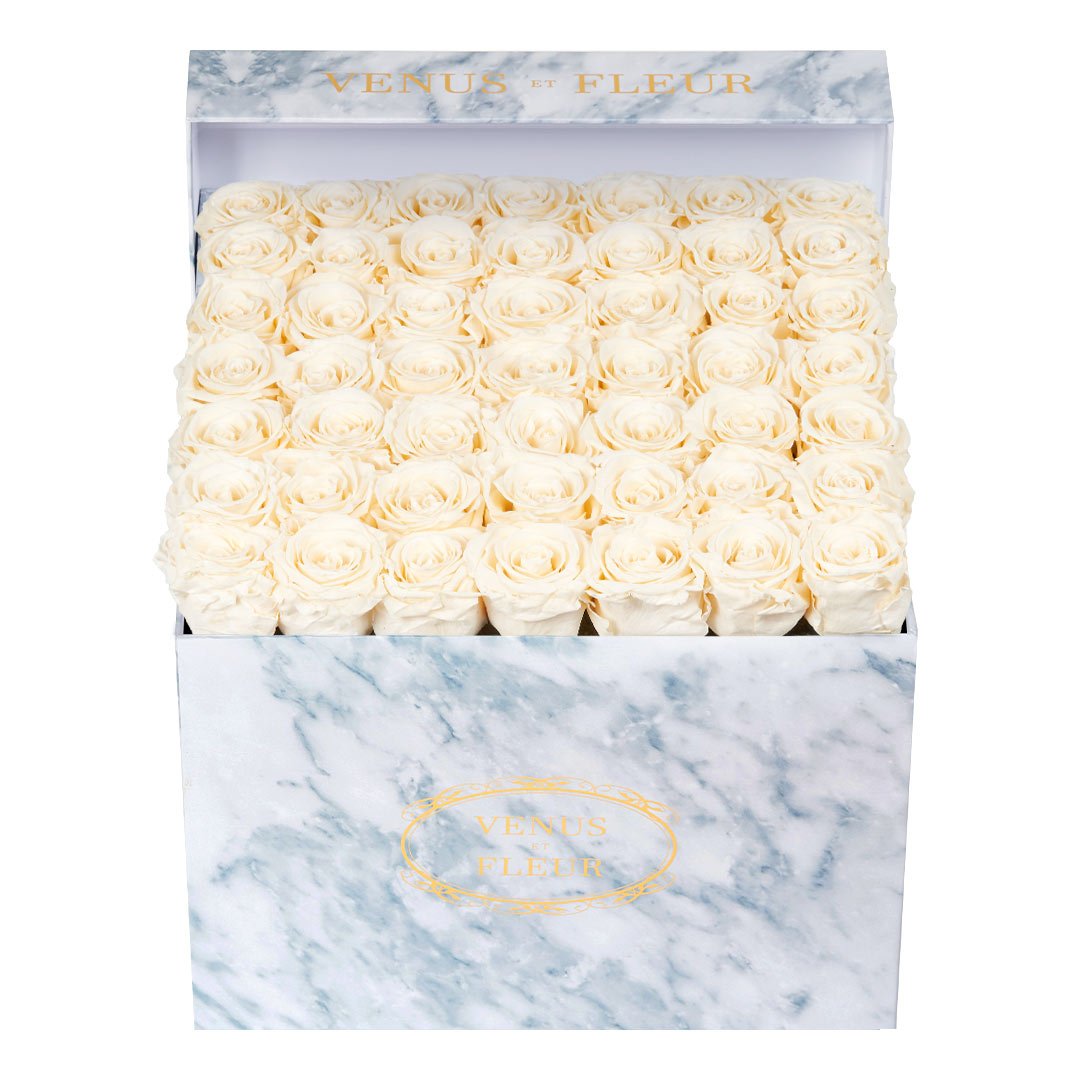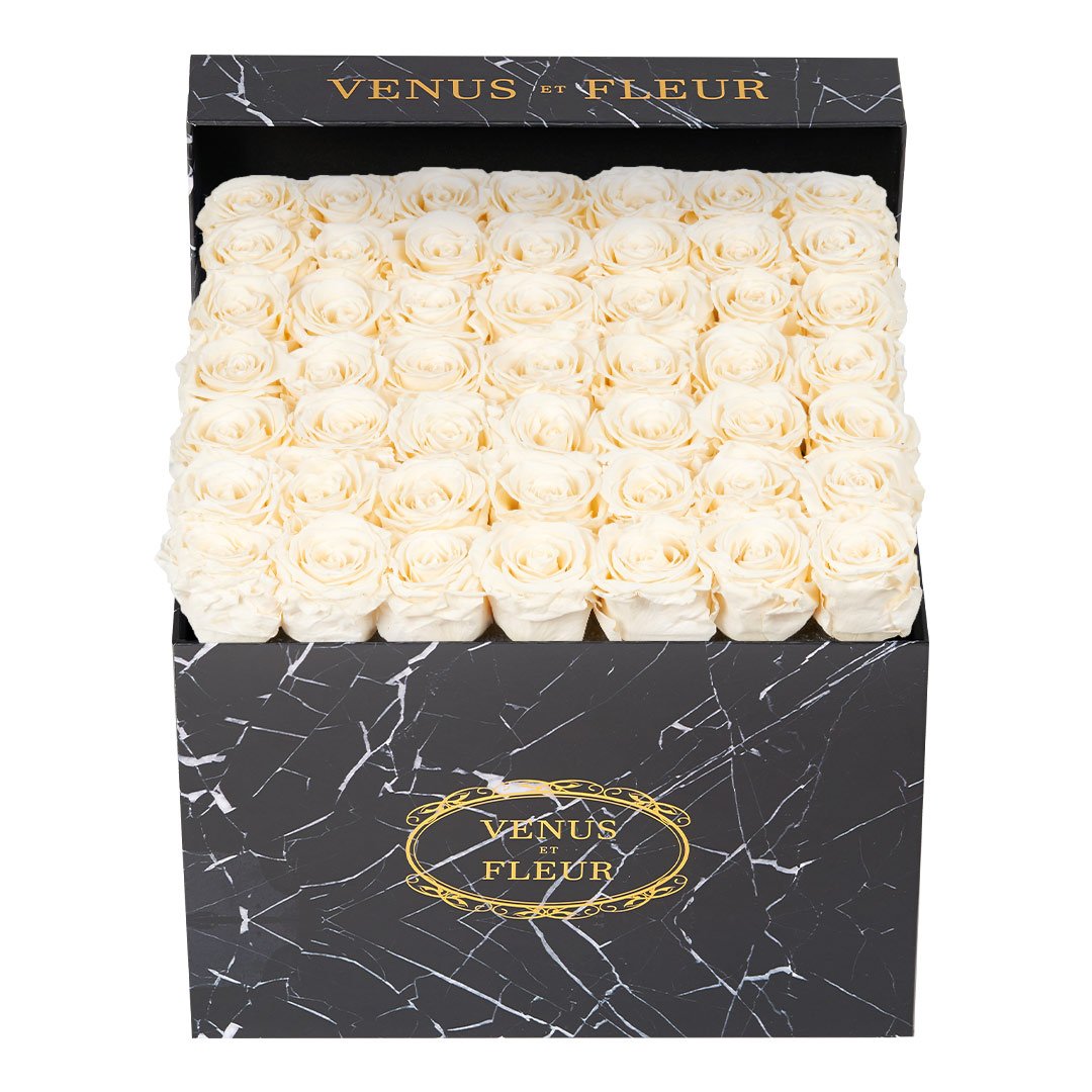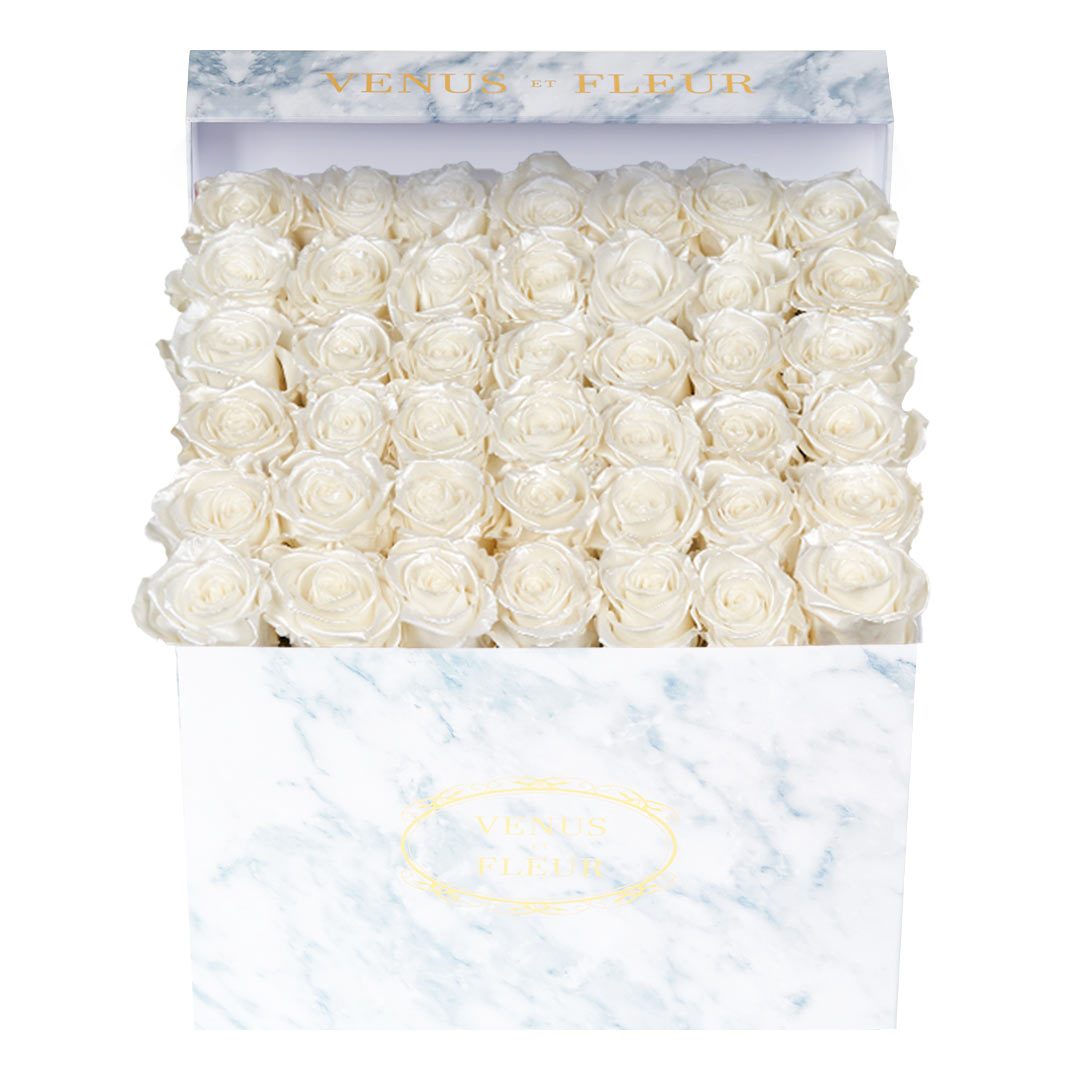 Our timeless Large Square arrangements are comprised of 42-49 exquisite Eternity Roses set in elegant, tremendous square vases that will introduce an element of luxury to any space. Our beautiful Grandir collection features a subtle embossed texture in ivory and honors our fifth anniversary. Our marble collection has a legacy of sophistication edging back generations and will be sure to elevate your space.