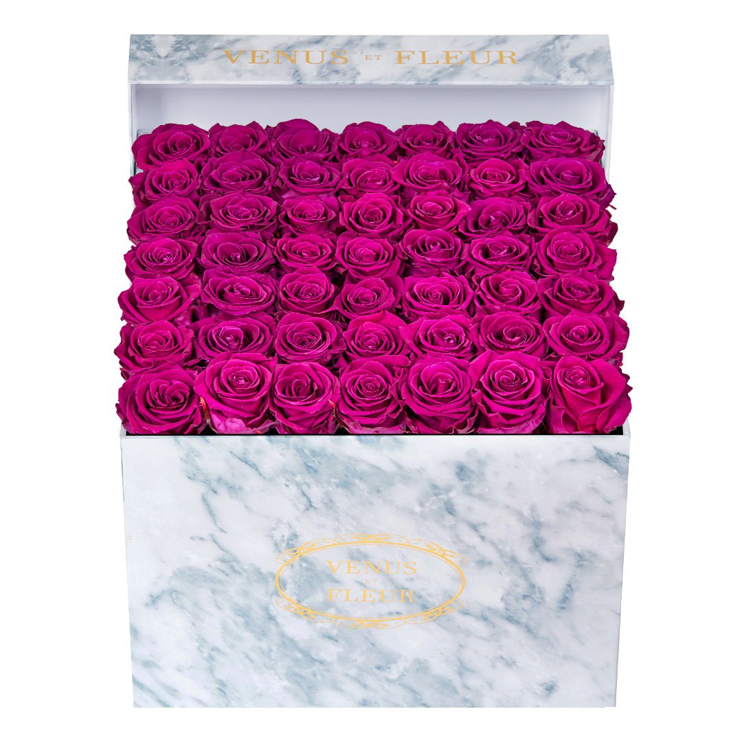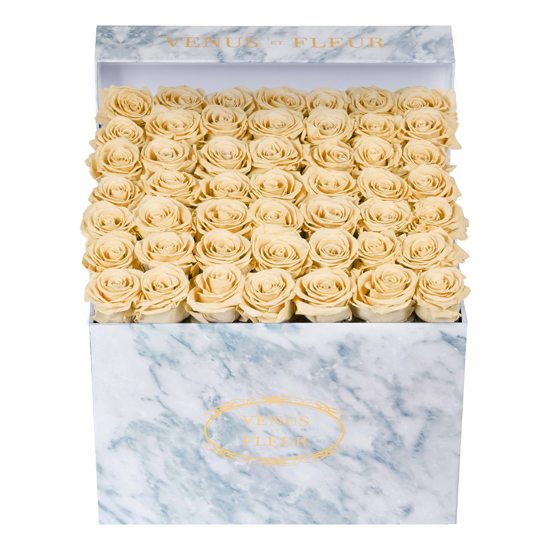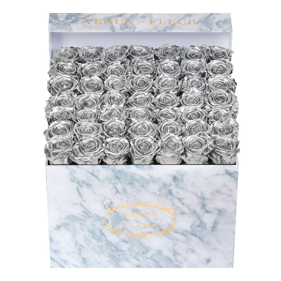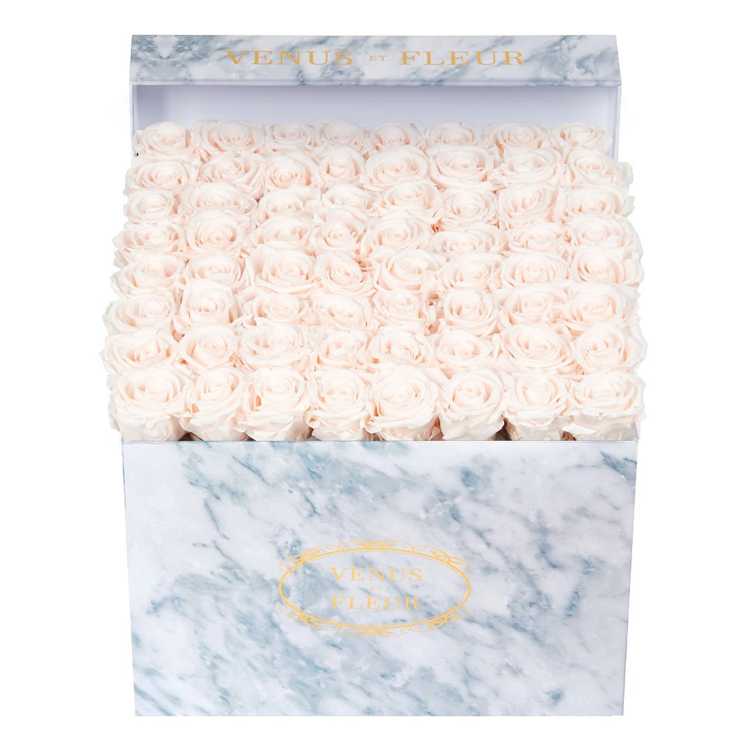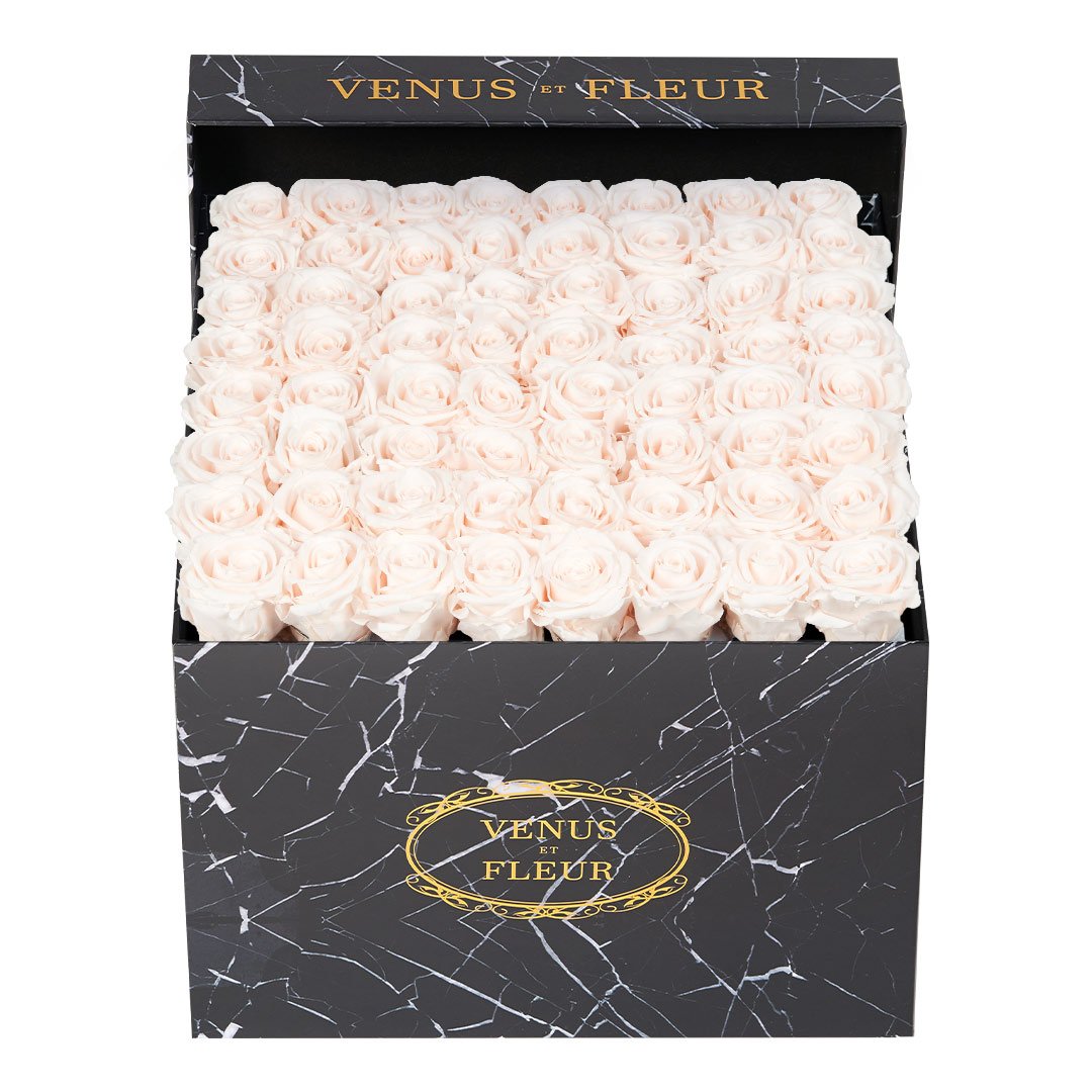 Our timeless Large Square arrangements are comprised of 42-49 exquisite Eternity Roses set in elegant, tremendous square vases that will introduce an element of luxury to any space. Our beautiful Grandir collection features a subtle embossed texture in ivory and honors our fifth anniversary. Our marble collection has a legacy of sophistication edging back generations and will be sure to elevate your space.