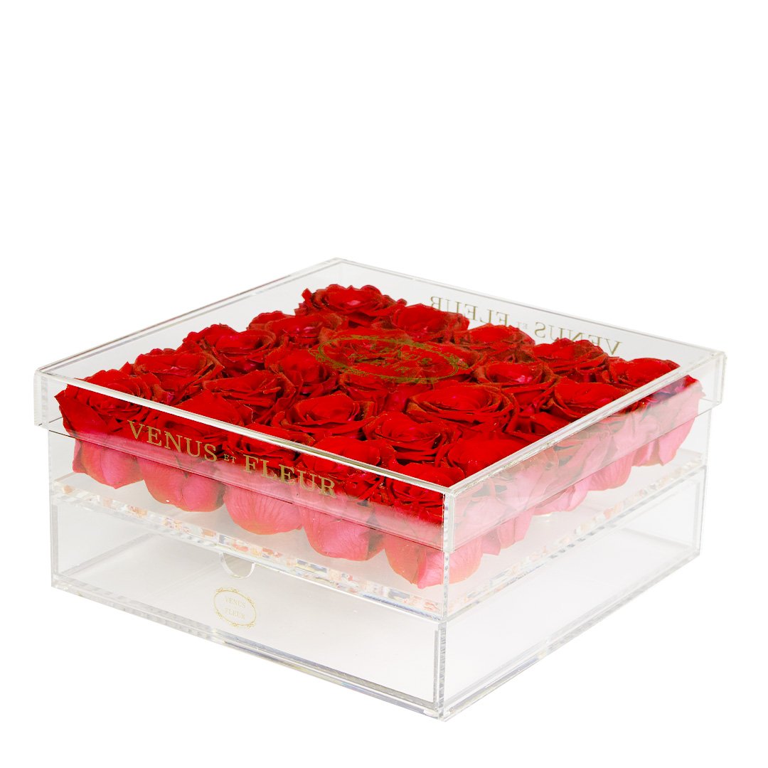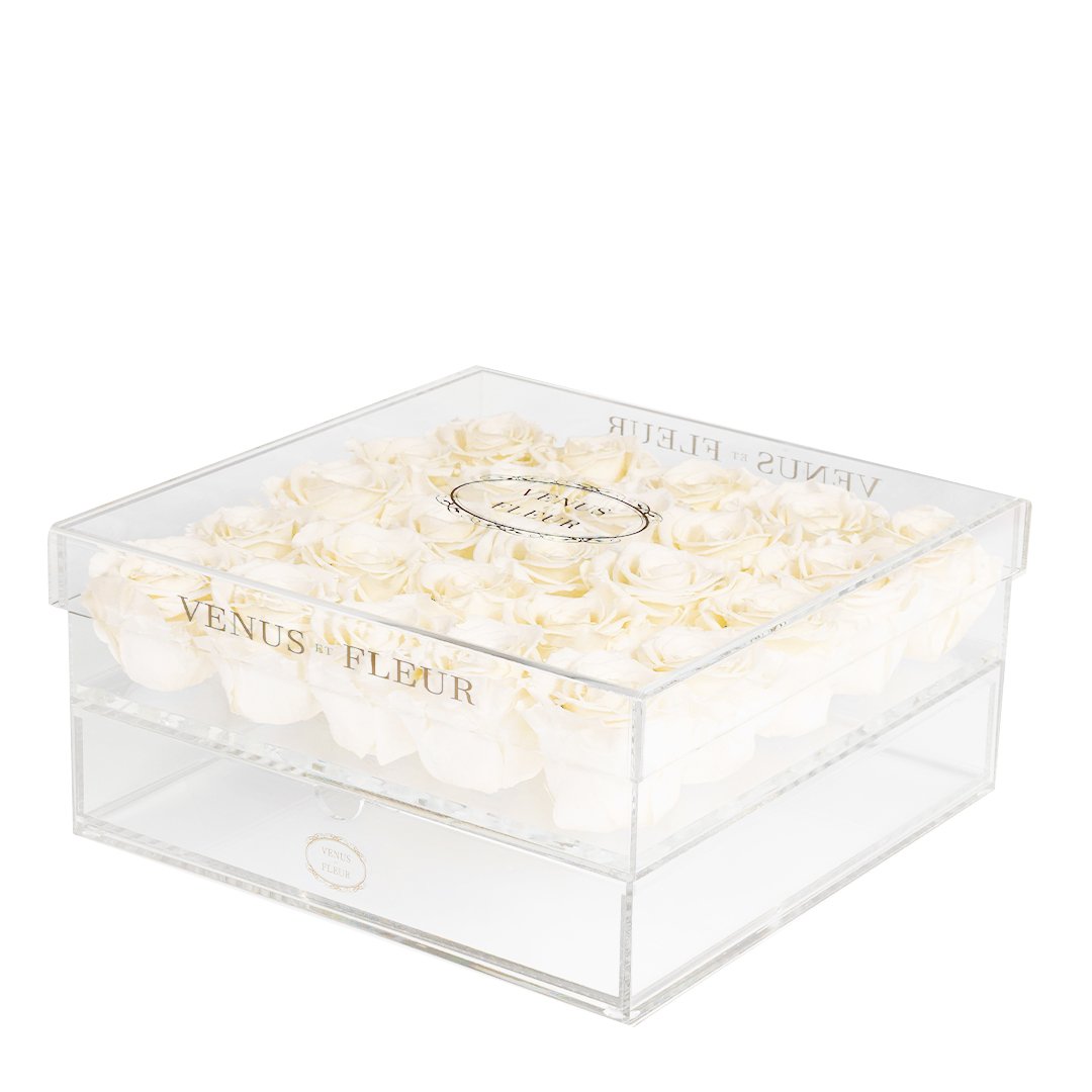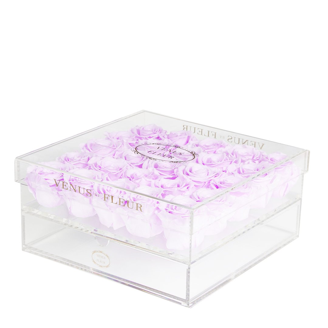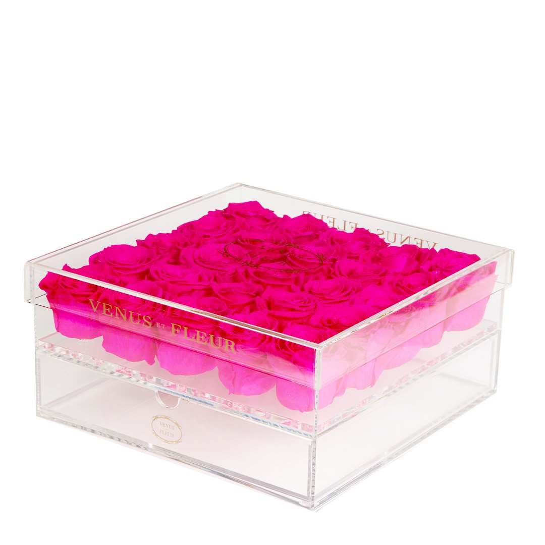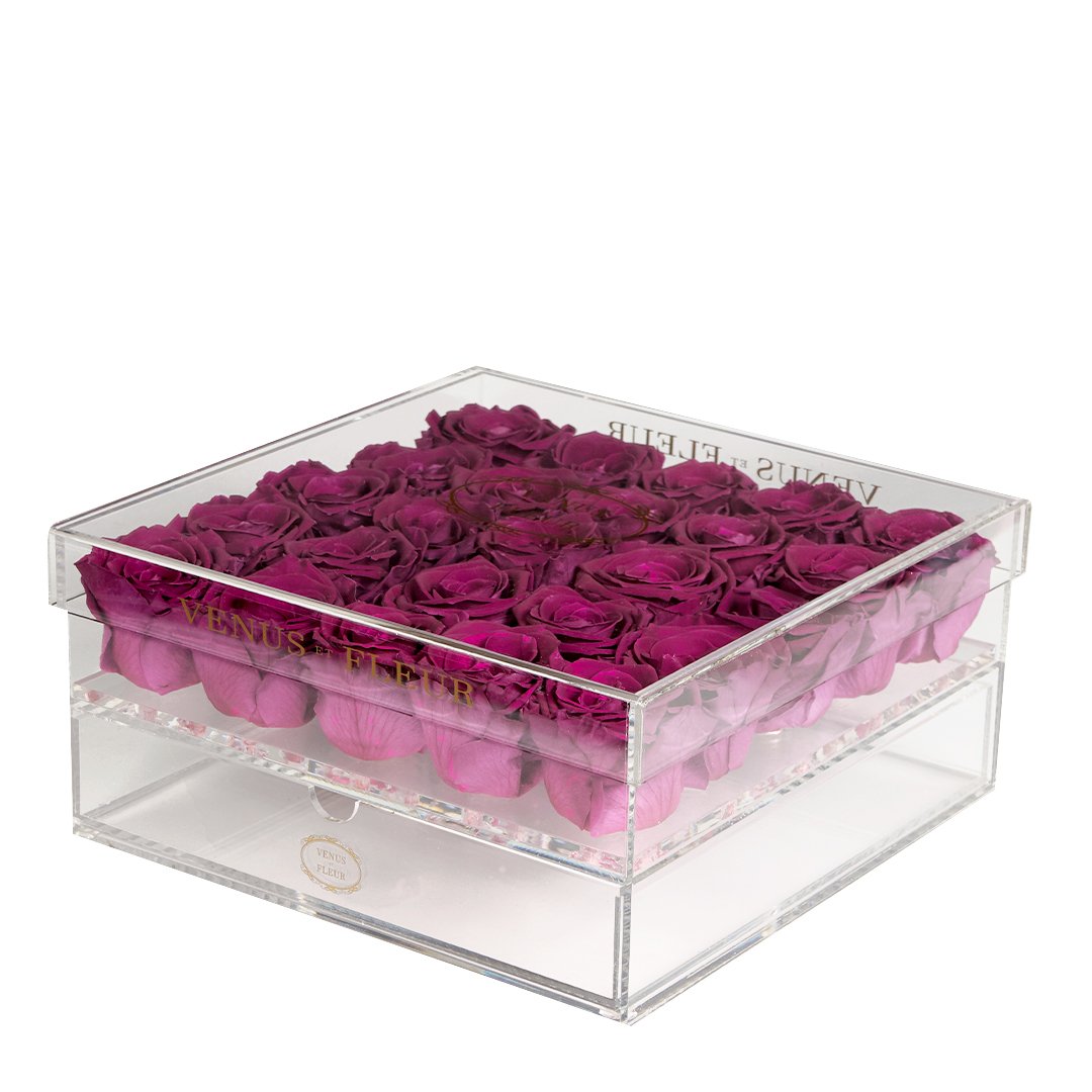 The Le Clair Vingt-Cinq features 25 stunning Eternity® Roses encased in a sleek, clear acrylic case that protects the roses while displaying their true beauty. A hidden storage drawer beneath a top layer of roses makes this arrangement of boxed roses as functional as it is gorgeous.
