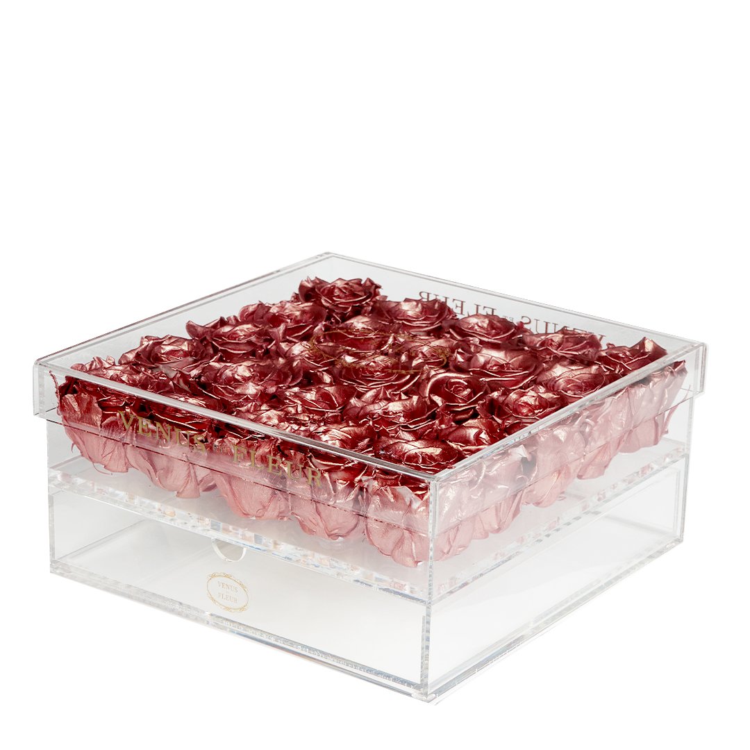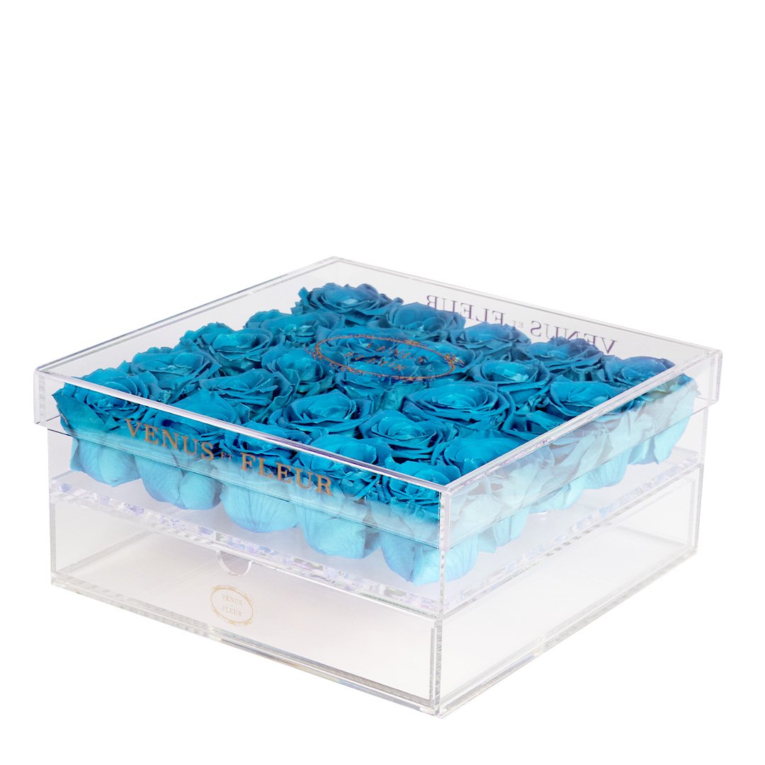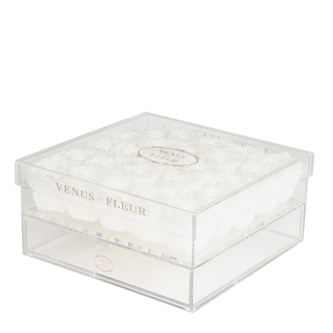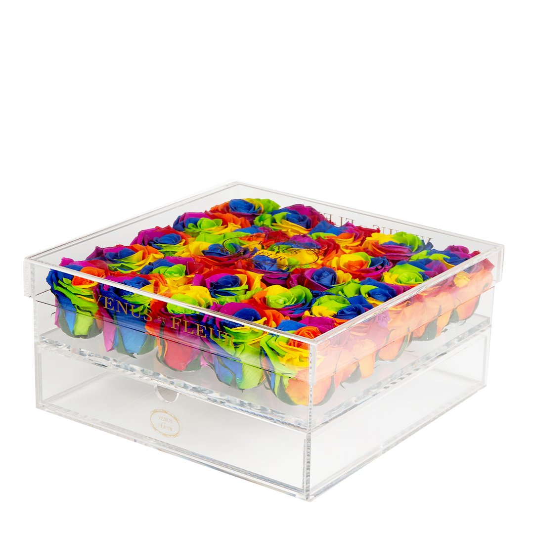 The Le Clair Vingt-Cinq features 25 stunning Eternity® Roses encased in a sleek, clear acrylic case that protects the roses while displaying their true beauty. A hidden storage drawer beneath a top layer of roses makes this arrangement of boxed roses as functional as it is gorgeous.