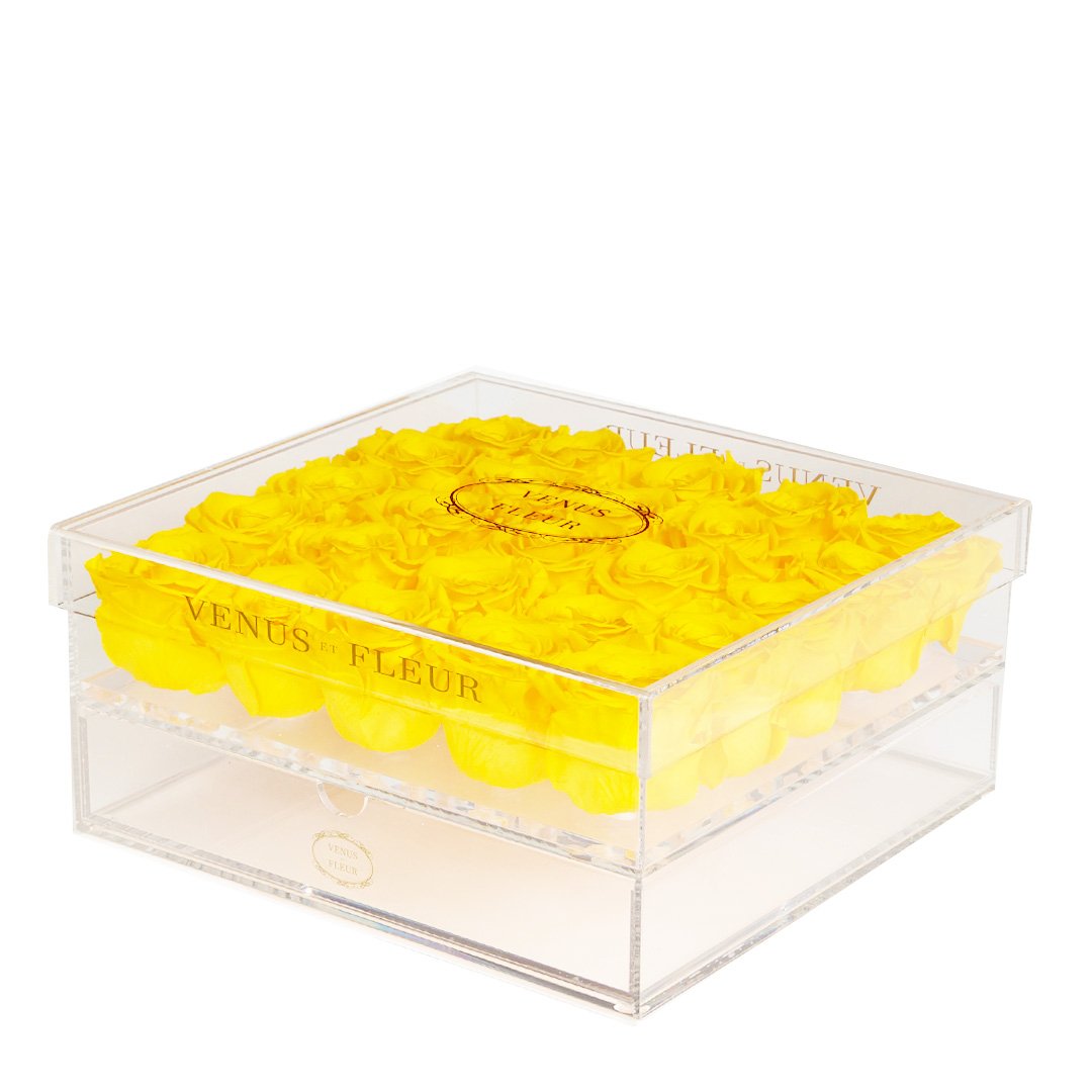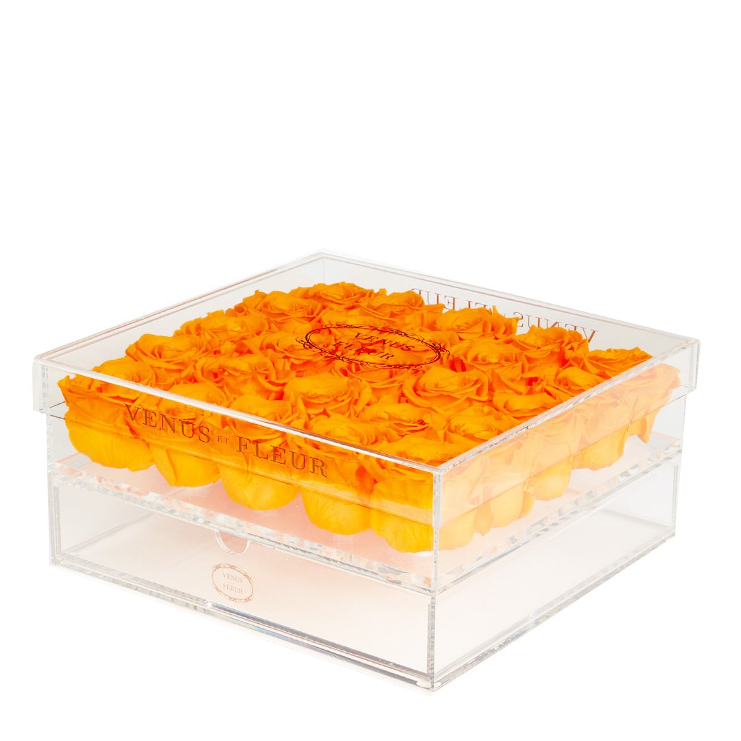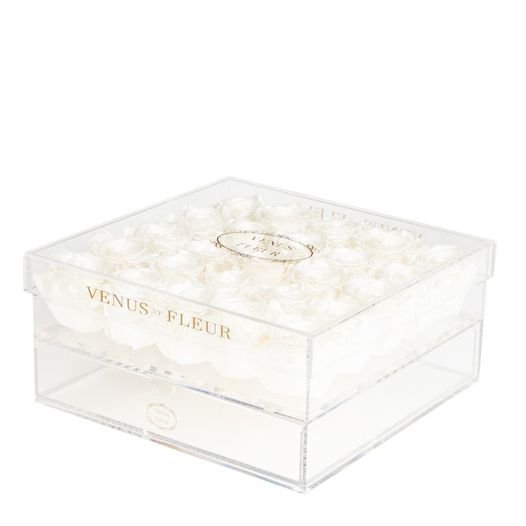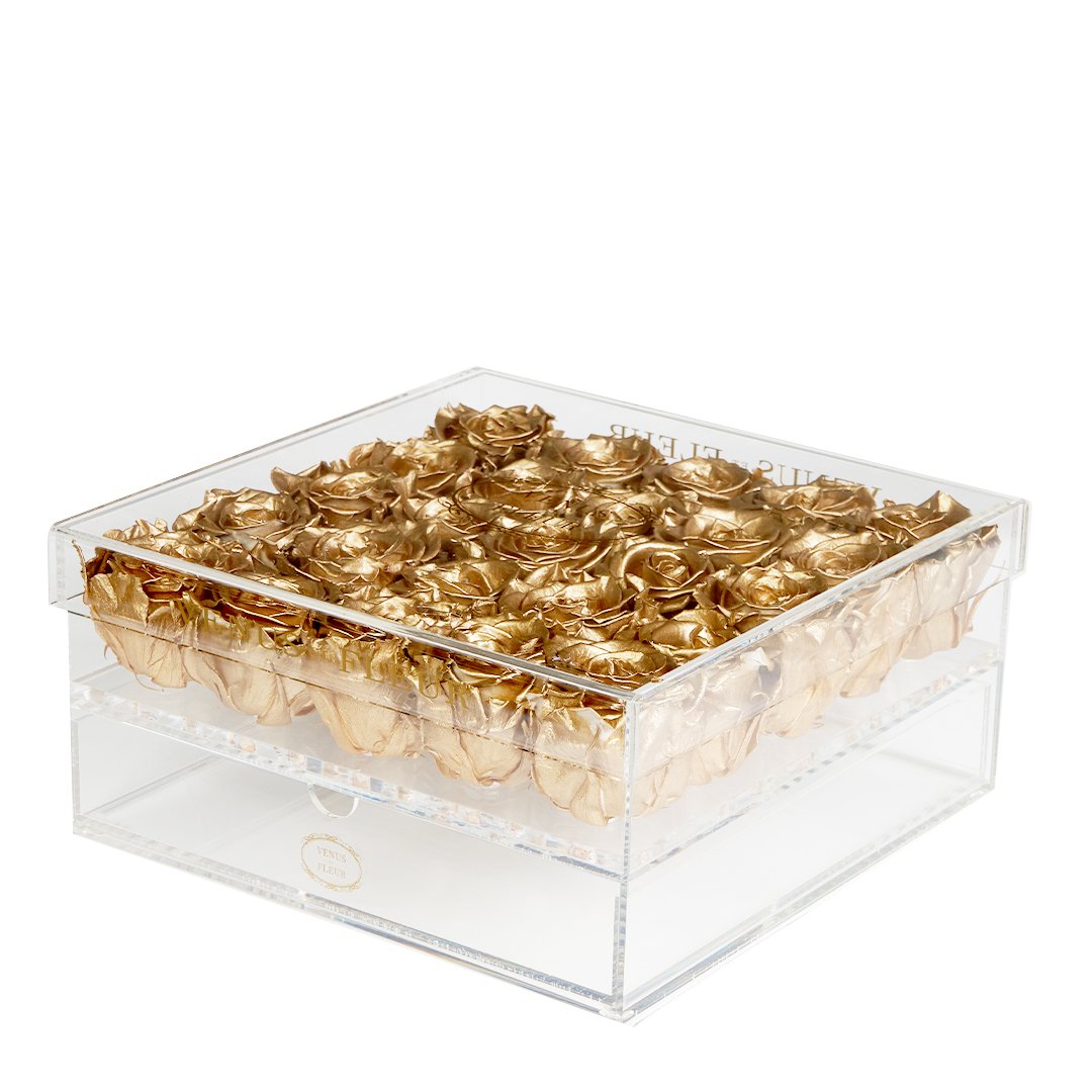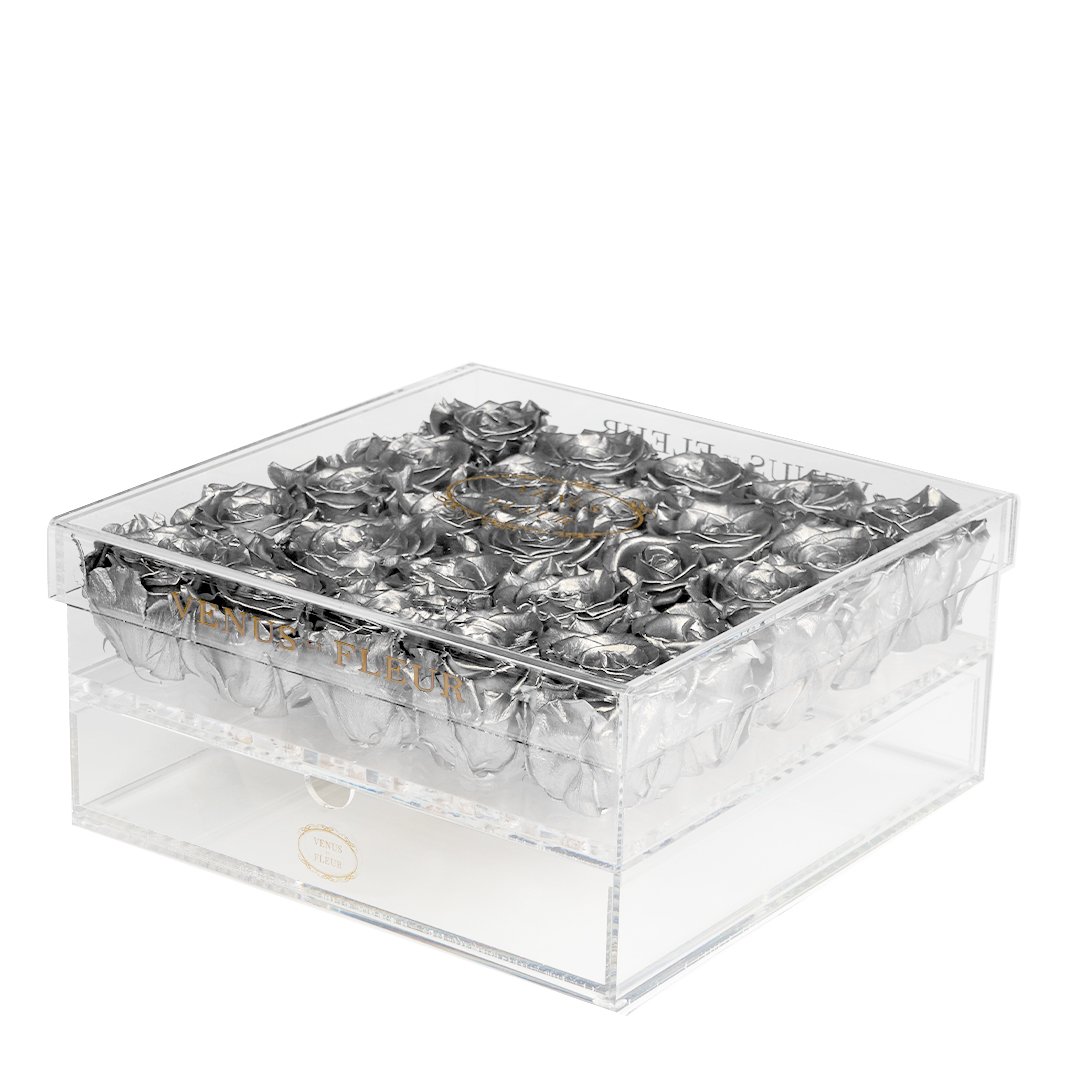 The Le Clair Vingt-Cinq features 25 stunning Eternity® Roses encased in a sleek, clear acrylic case that protects the roses while displaying their true beauty. A hidden storage drawer beneath a top layer of roses makes this arrangement of boxed roses as functional as it is gorgeous.