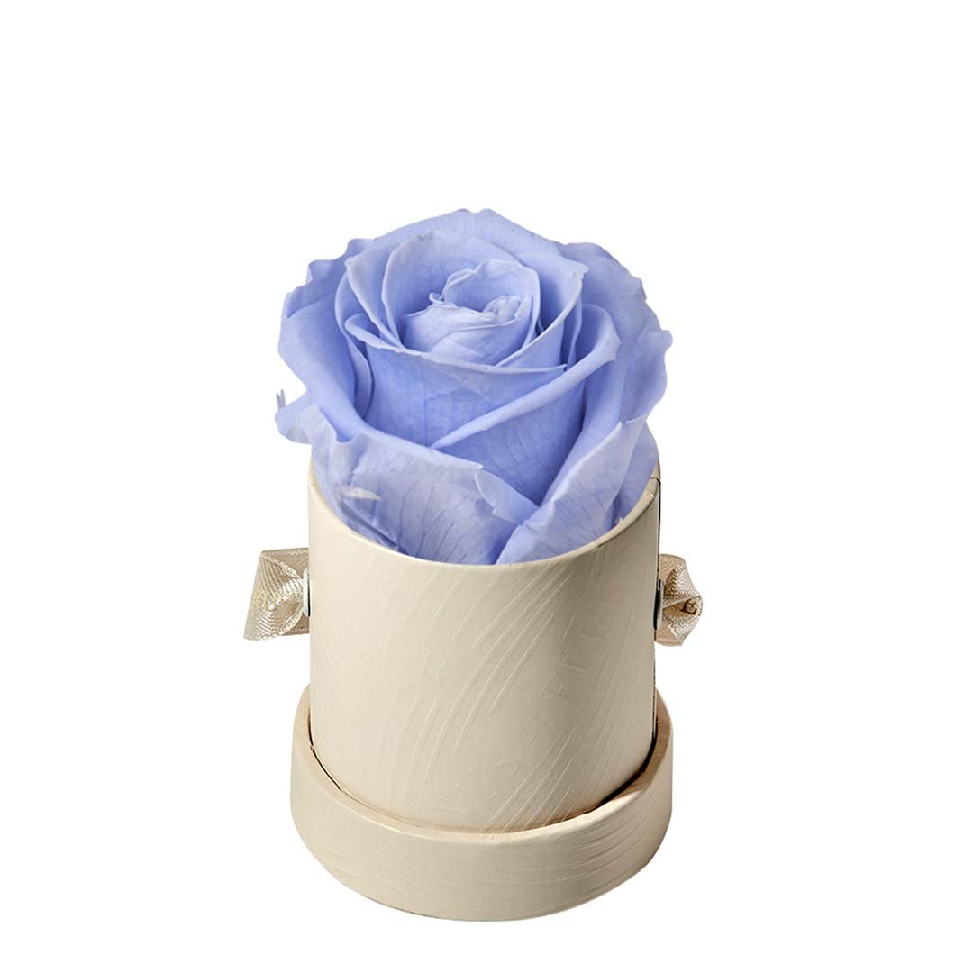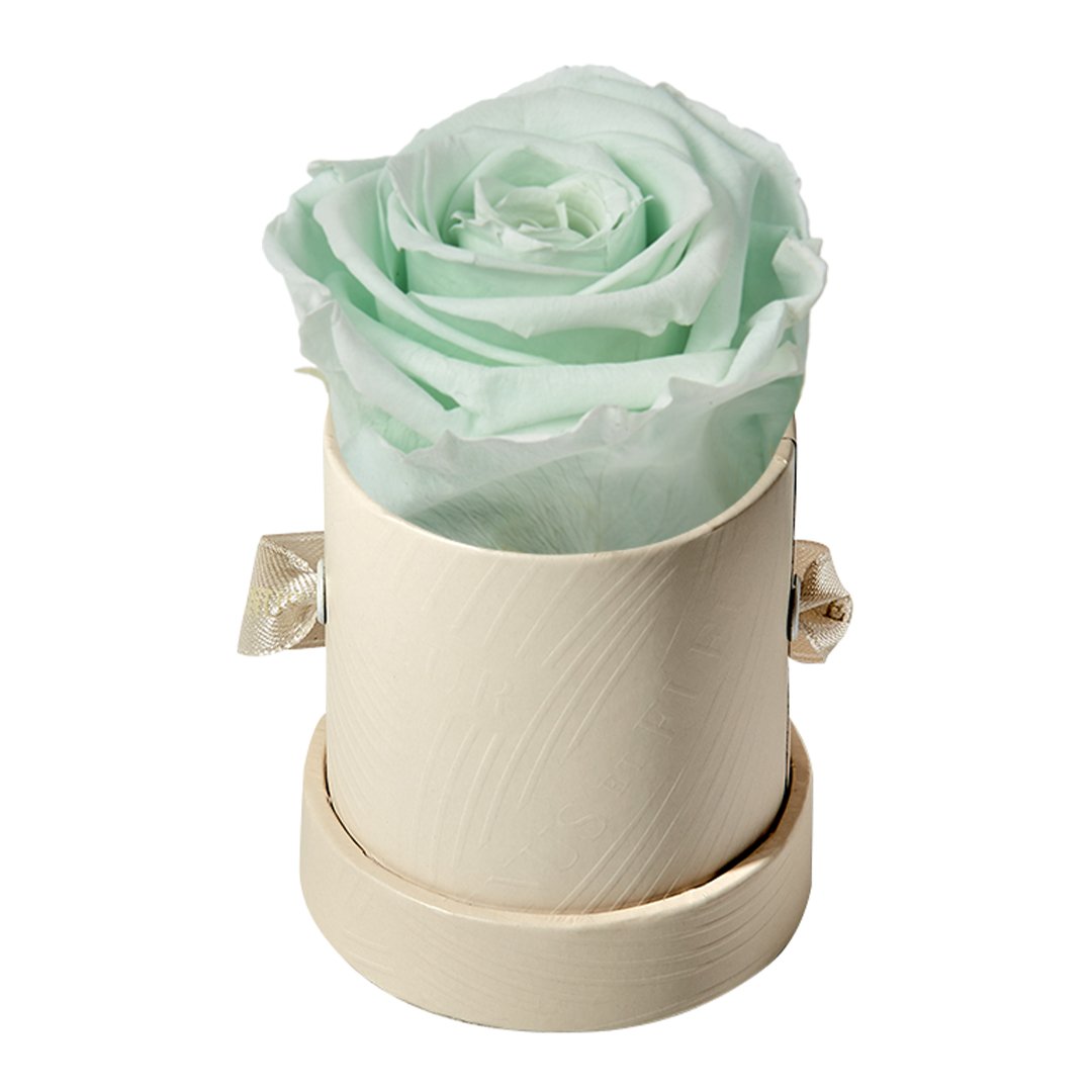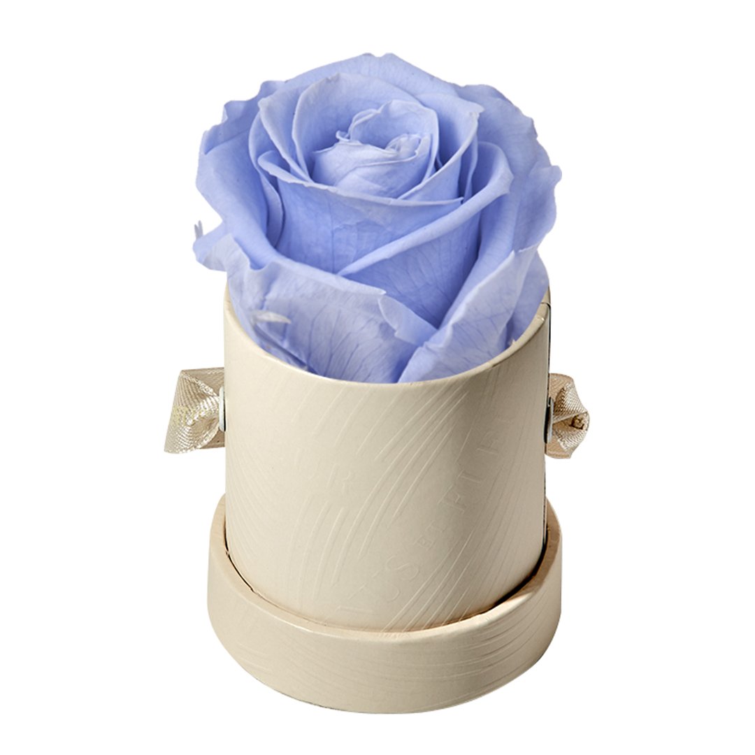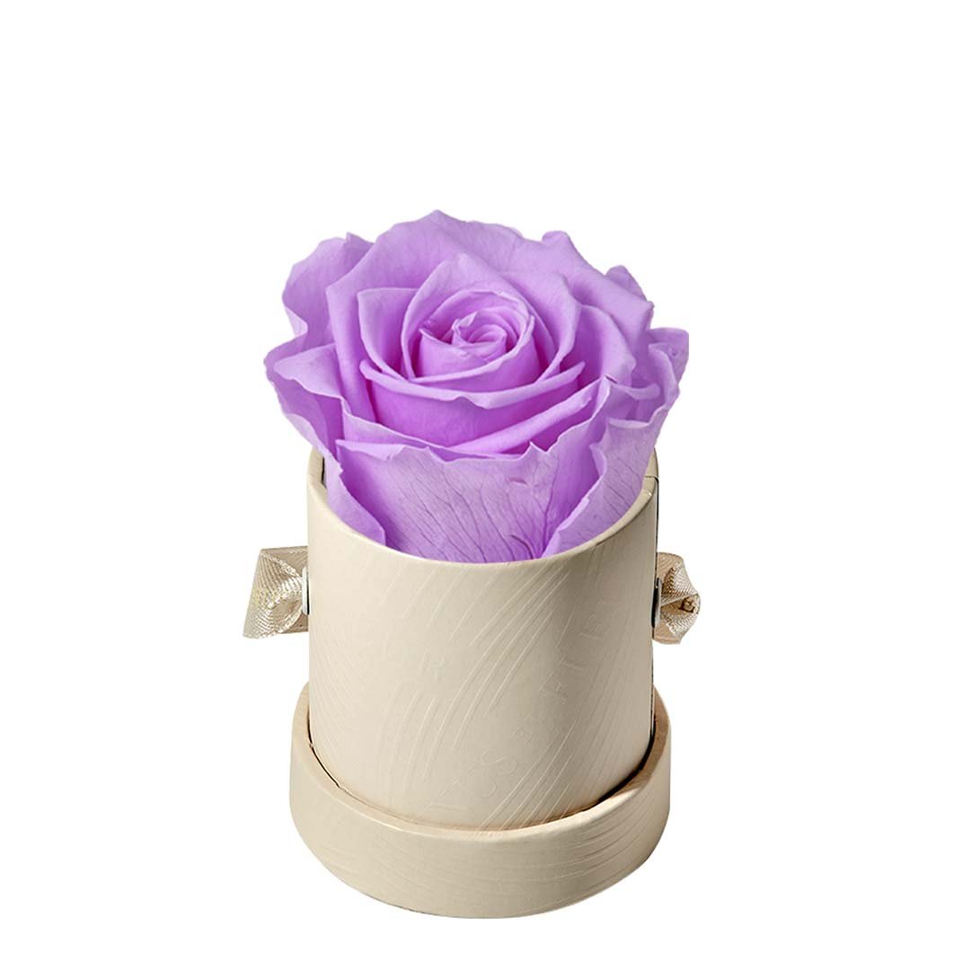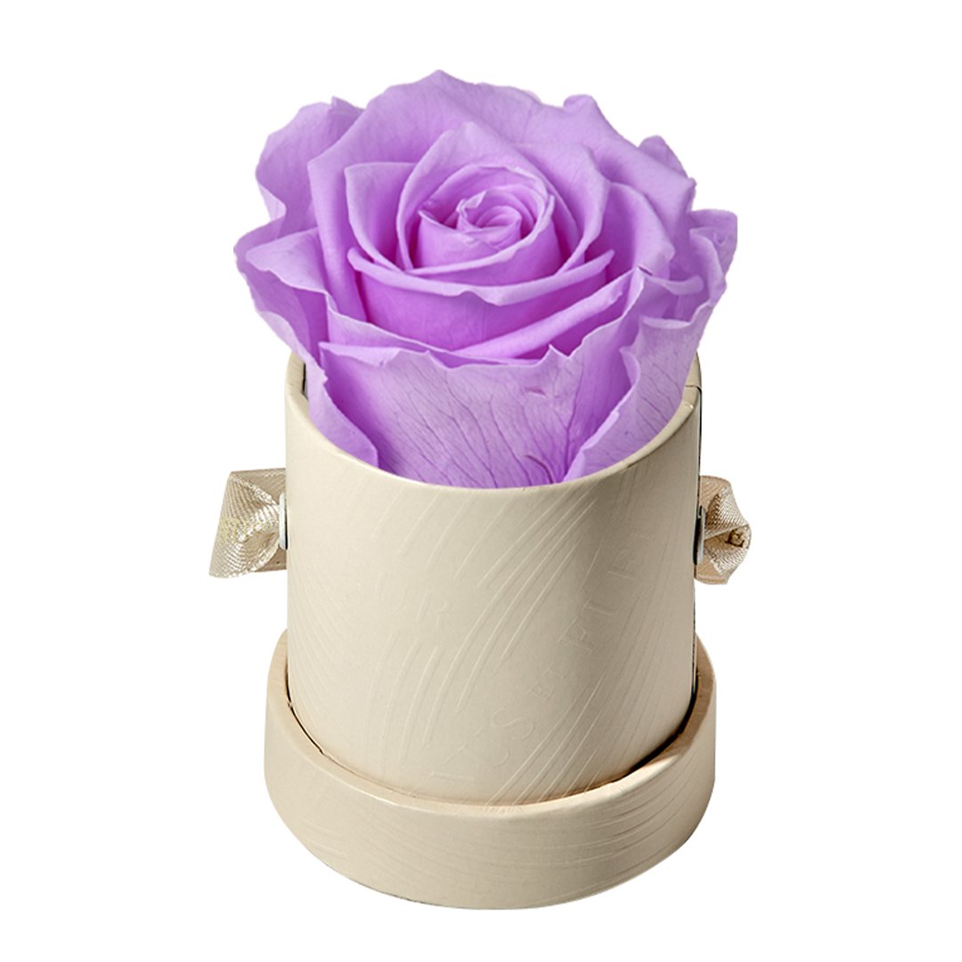 Our Le Mini arrangements feature a stunning, singular Eternity Rose®, set in our luxurious suede Parisian-hat box inspired round boxes. The Le Minis are ideal arrangements for elevating any small space, and serve as perfect gifts **Please note that variations will occur since all of our arrangements are uniquely handmade by our in-house designers.**