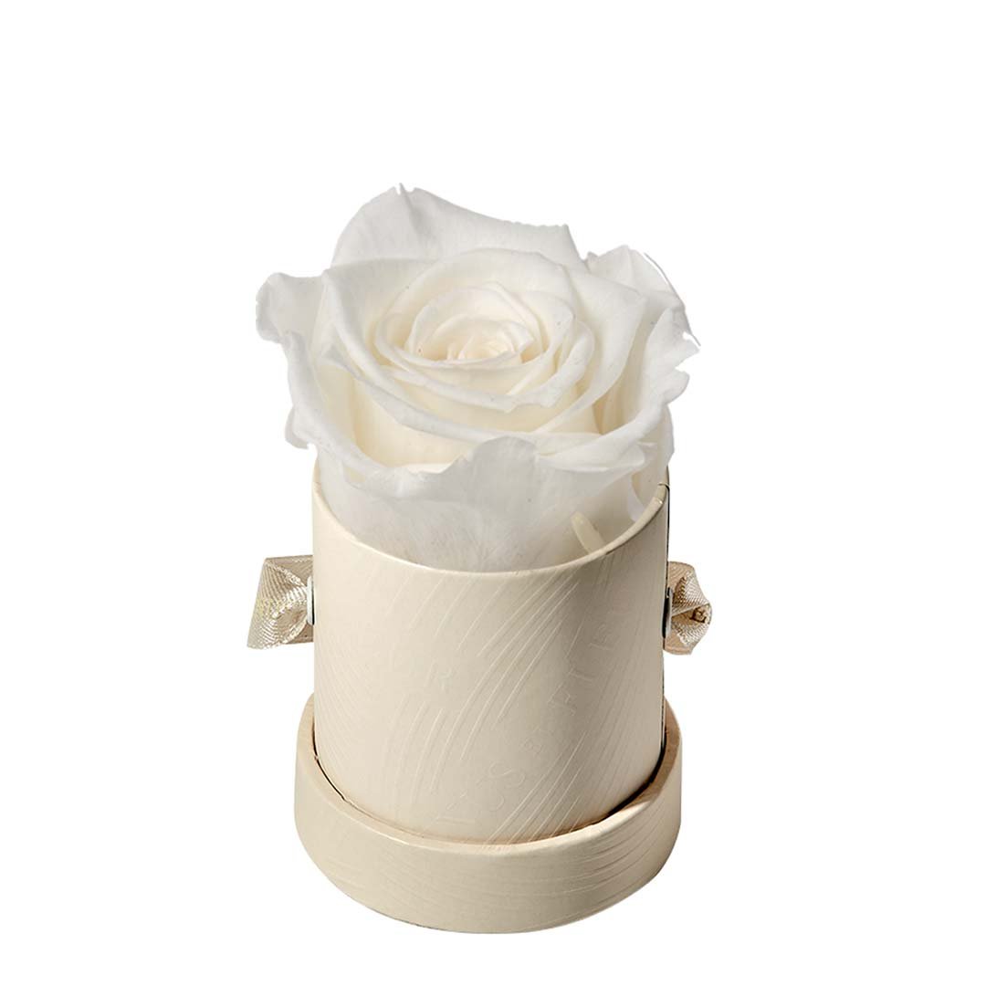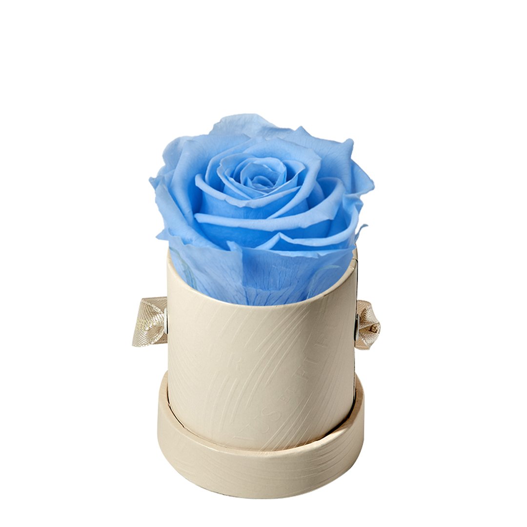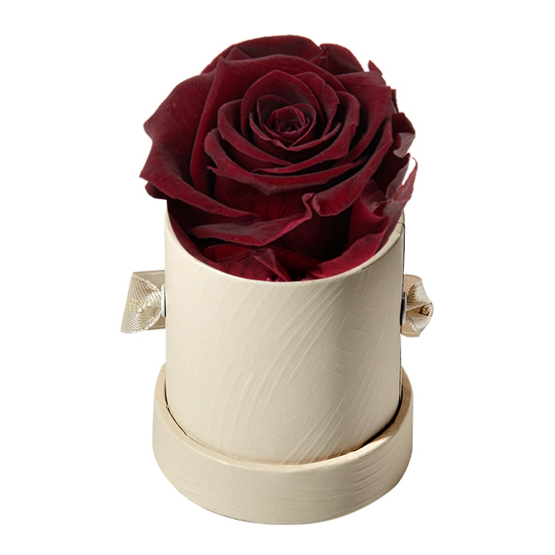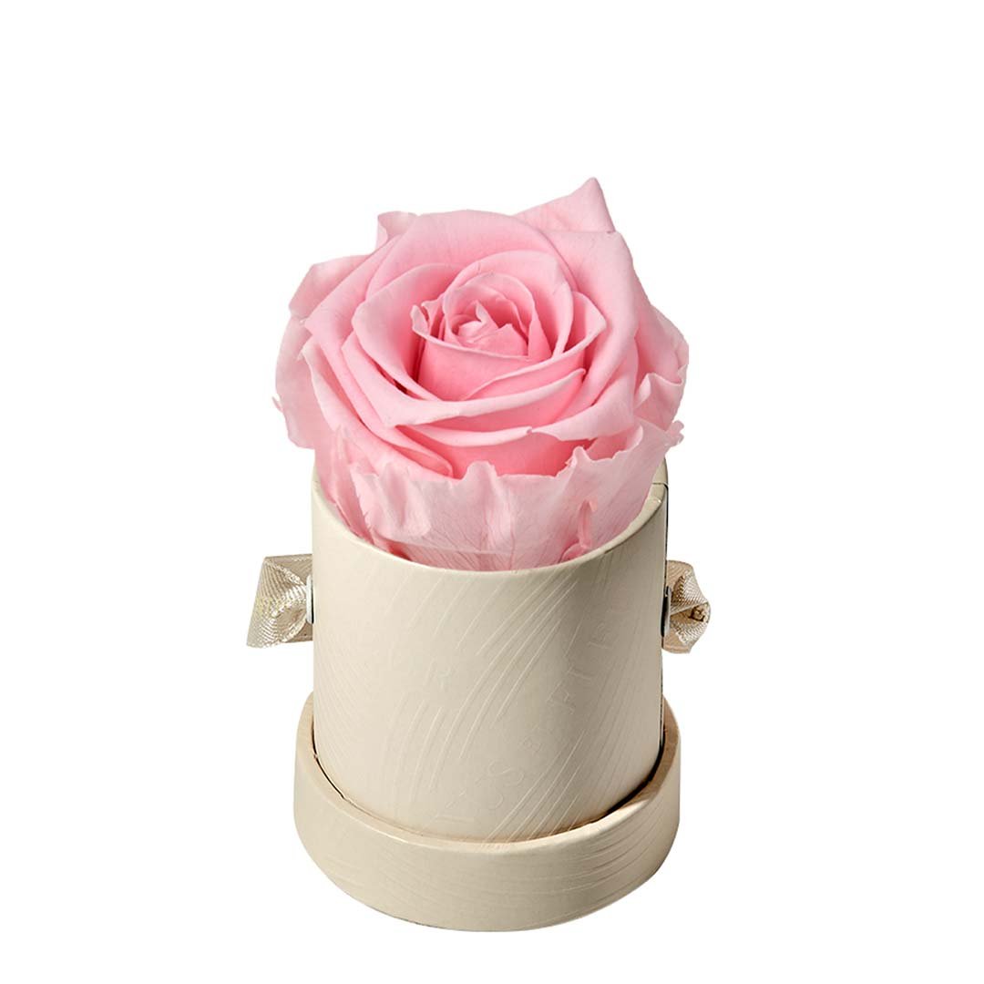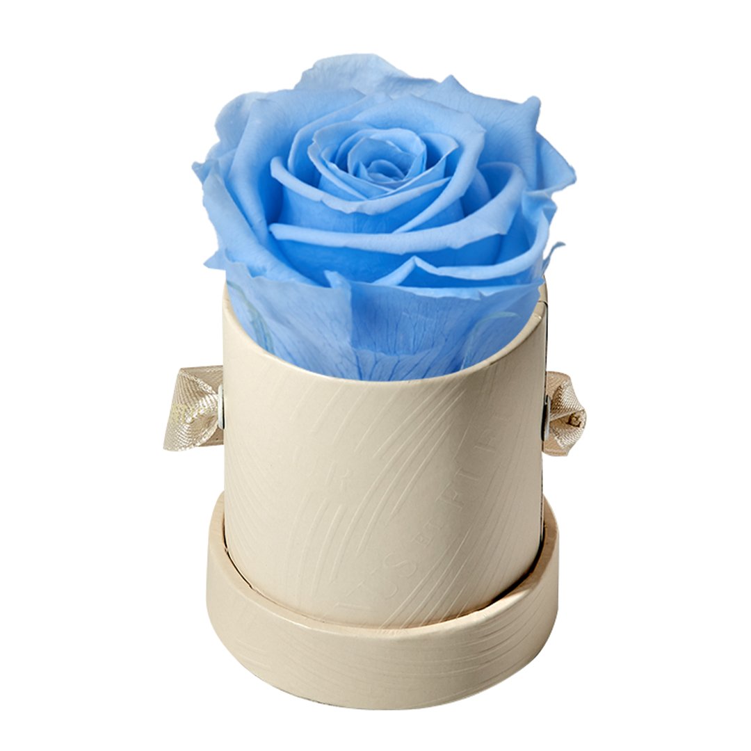 Our Le Mini arrangements feature a stunning, singular Eternity Rose®, set in our luxurious suede Parisian-hat box inspired round boxes. The Le Minis are ideal arrangements for elevating any small space, and serve as perfect gifts **Please note that variations will occur since all of our arrangements are uniquely handmade by our in-house designers.**