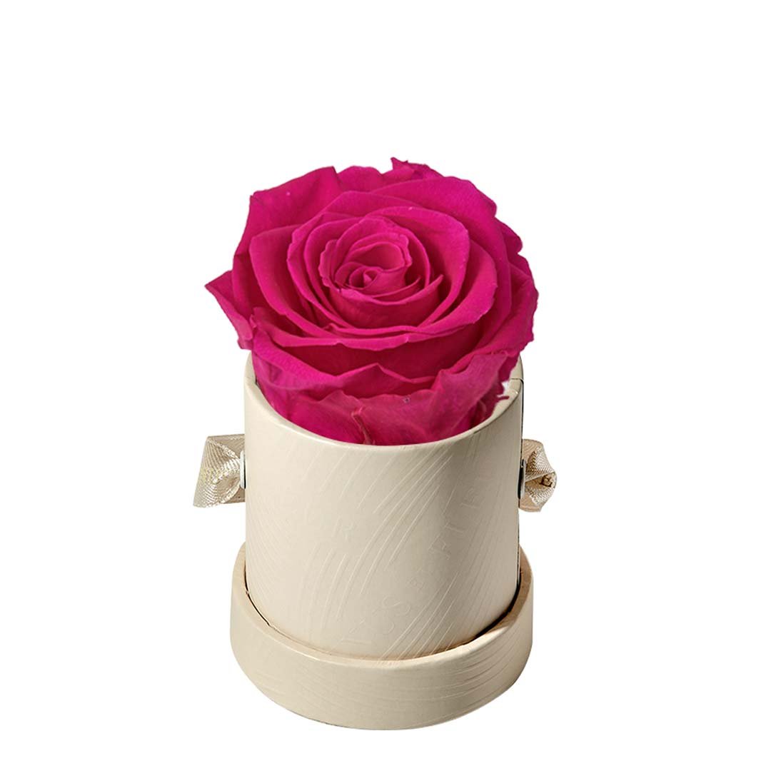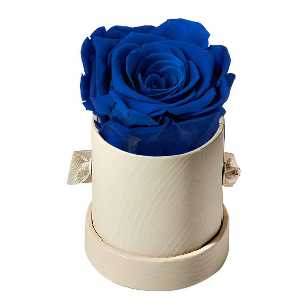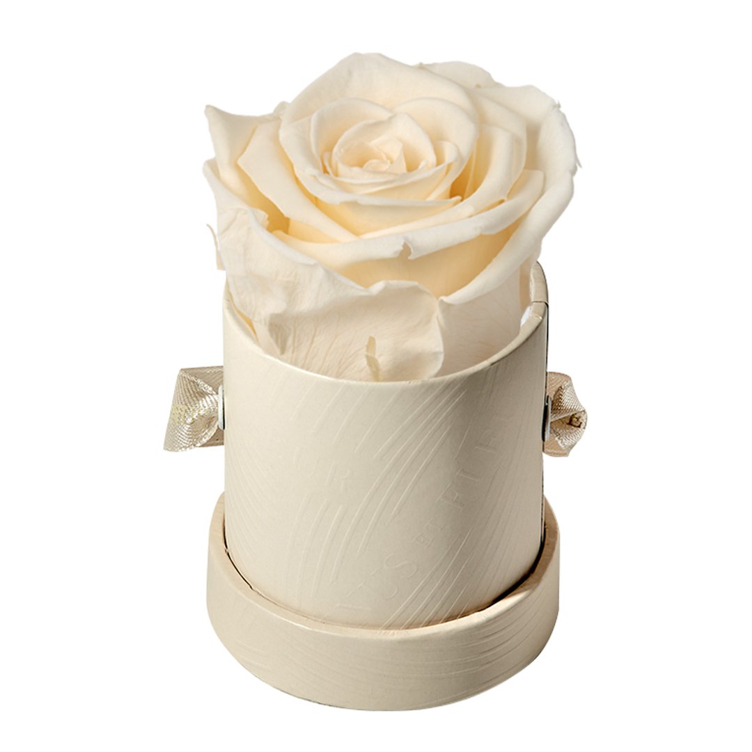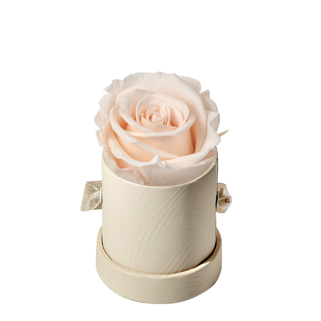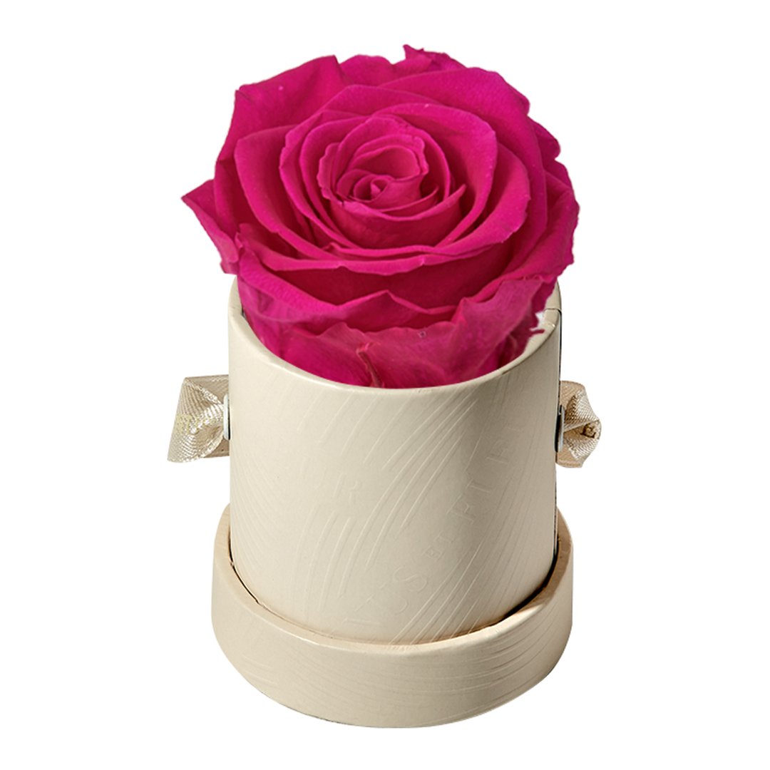 Our Le Mini arrangements feature a stunning, singular Eternity Rose®, set in our luxurious suede Parisian-hat box inspired round boxes. The Le Minis are ideal arrangements for elevating any small space, and serve as perfect gifts **Please note that variations will occur since all of our arrangements are uniquely handmade by our in-house designers.**