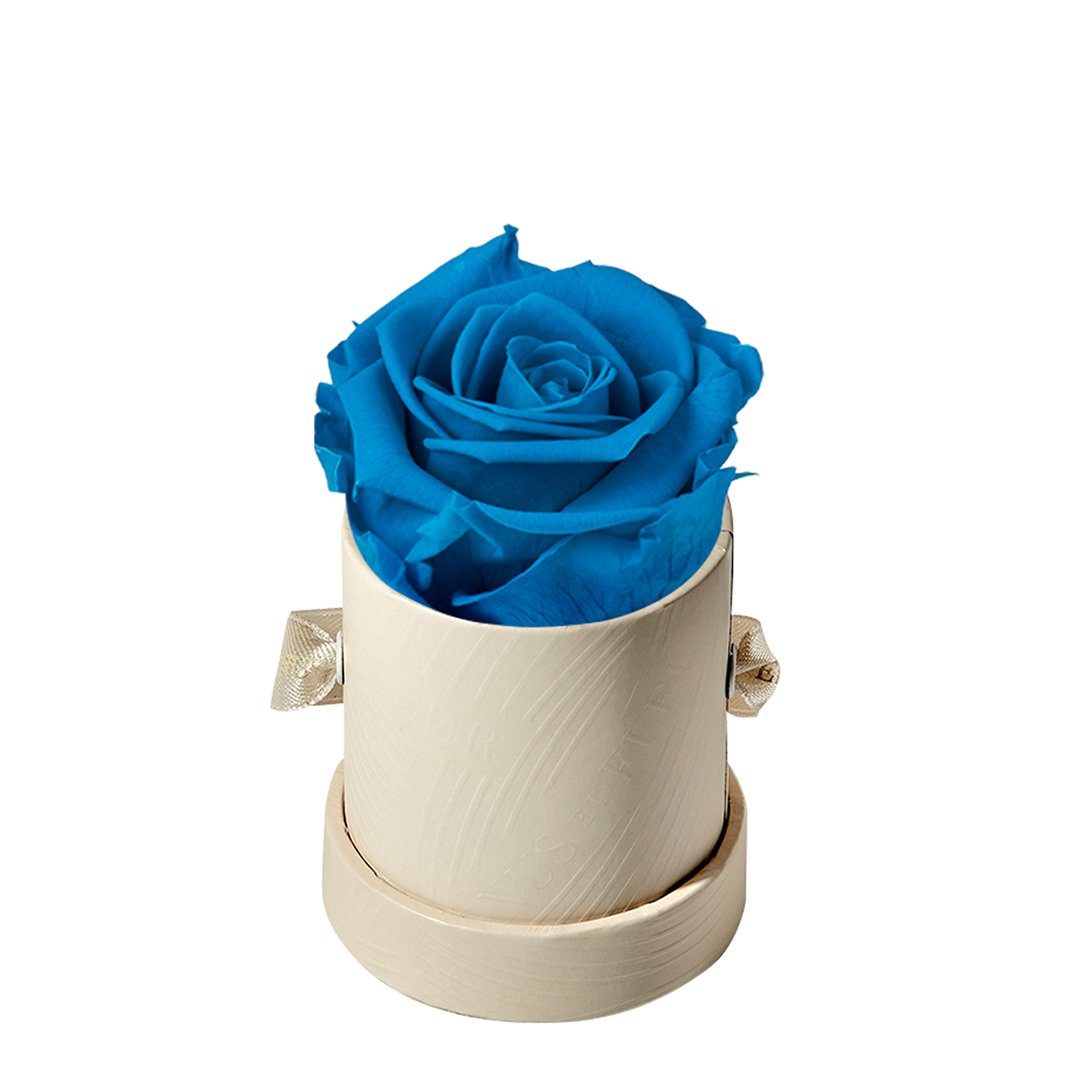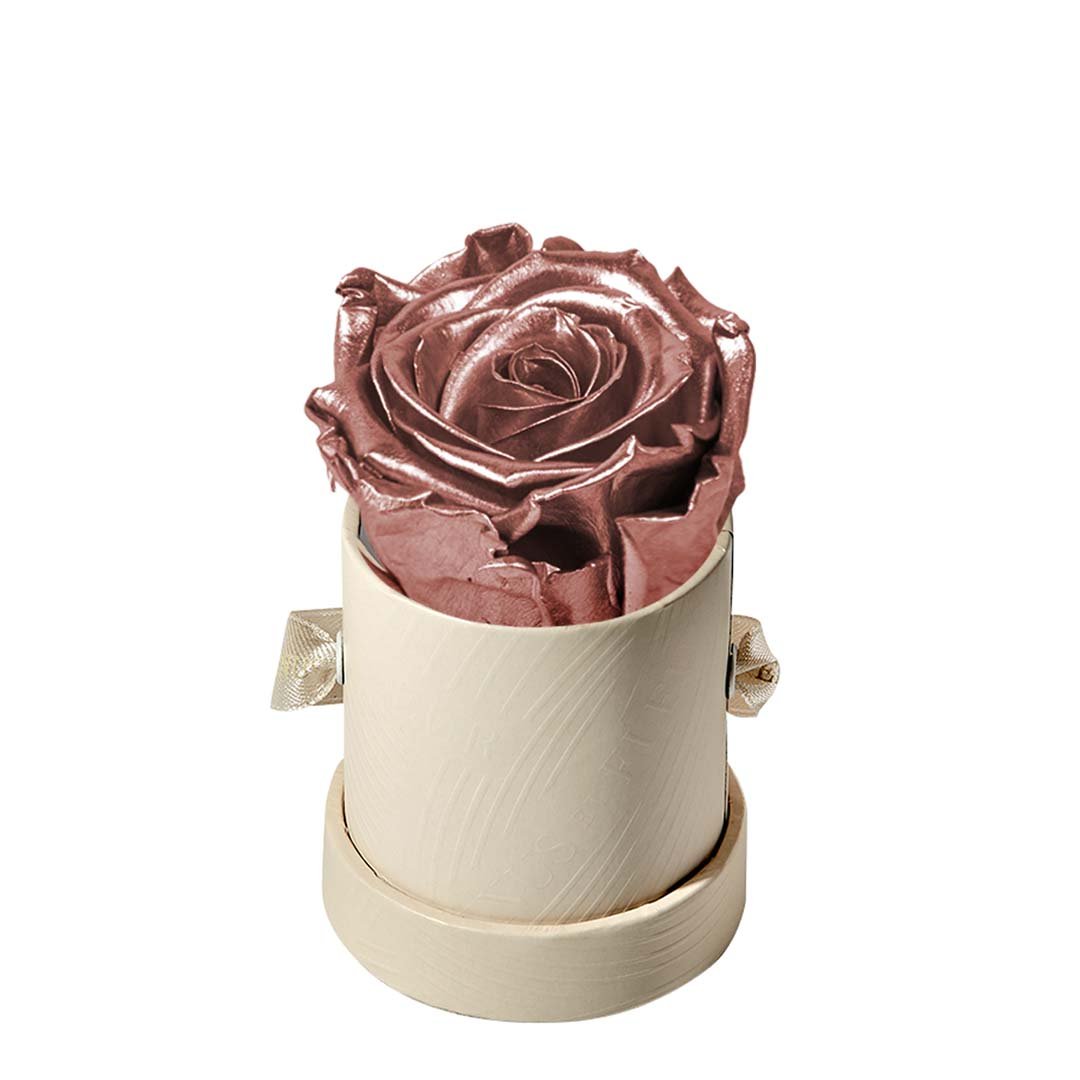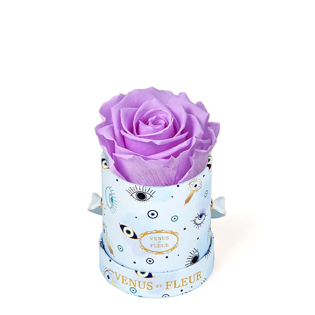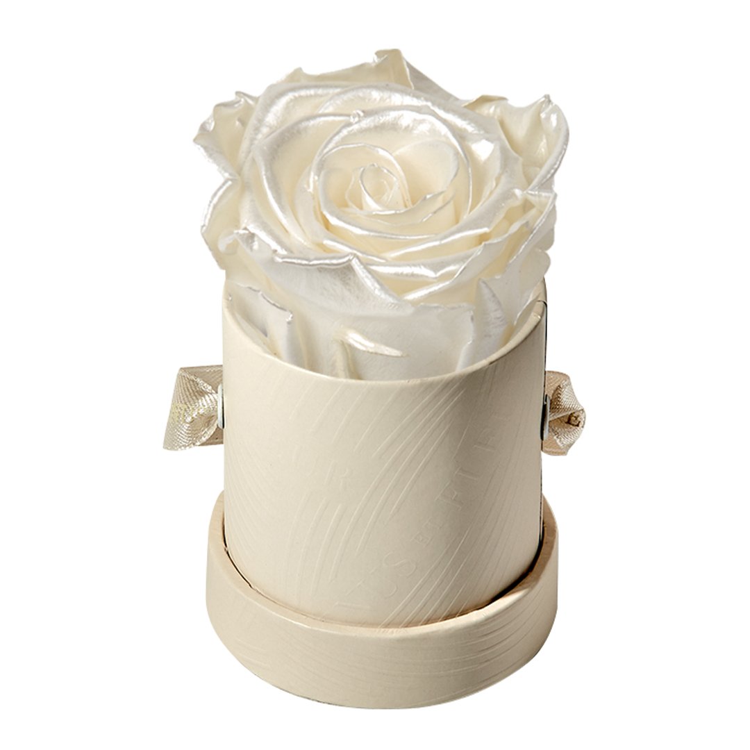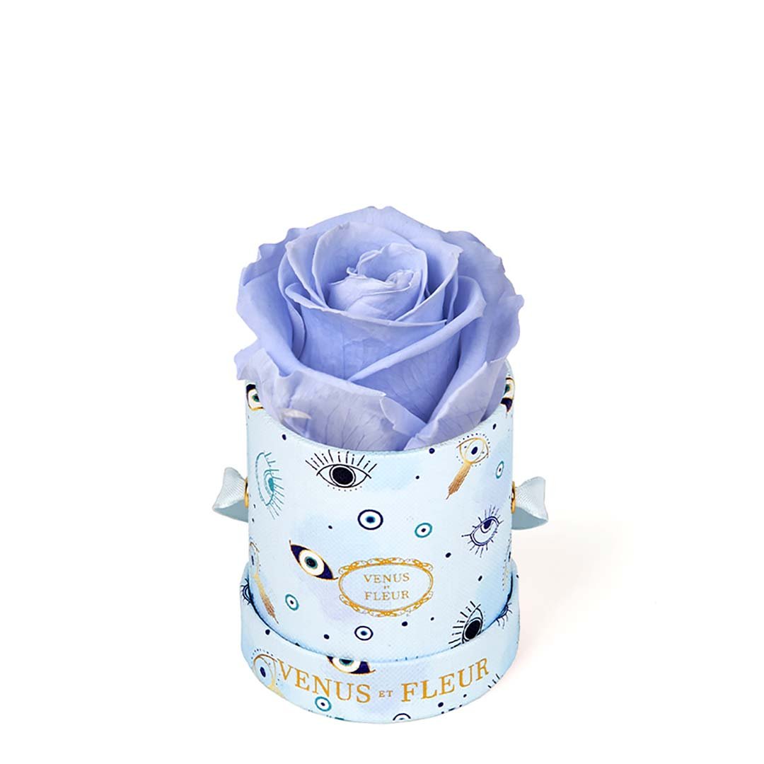 Our Le Mini arrangements feature a stunning, singular Eternity Rose®, set in our luxurious suede Parisian-hat box inspired round boxes. The Le Minis are ideal arrangements for elevating any small space, and serve as perfect gifts **Please note that variations will occur since all of our arrangements are uniquely handmade by our in-house designers.**