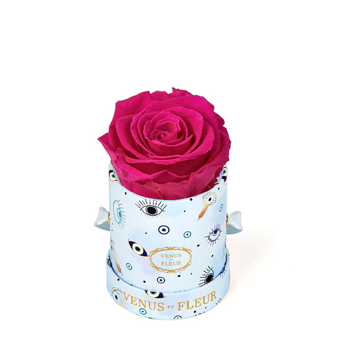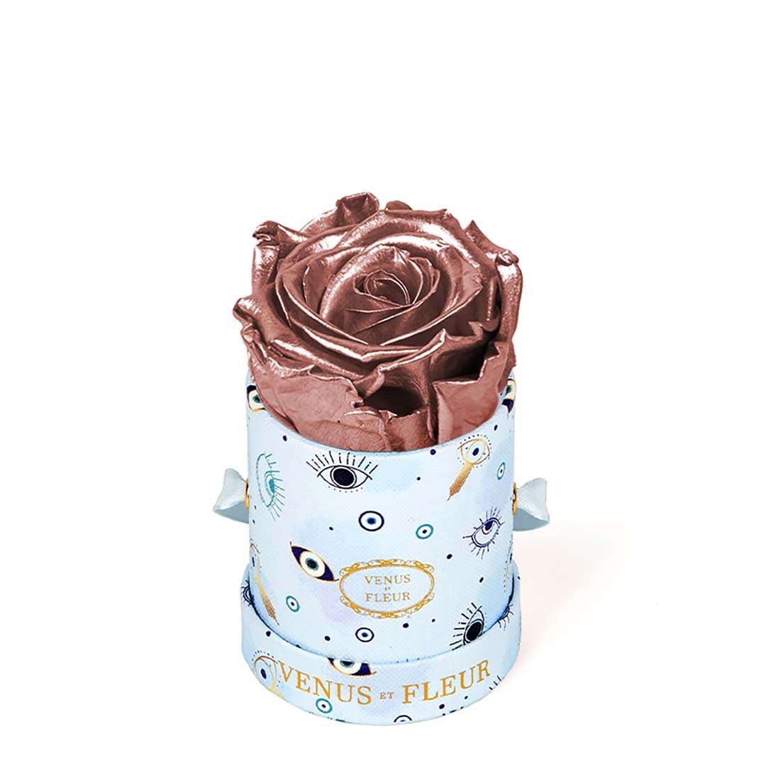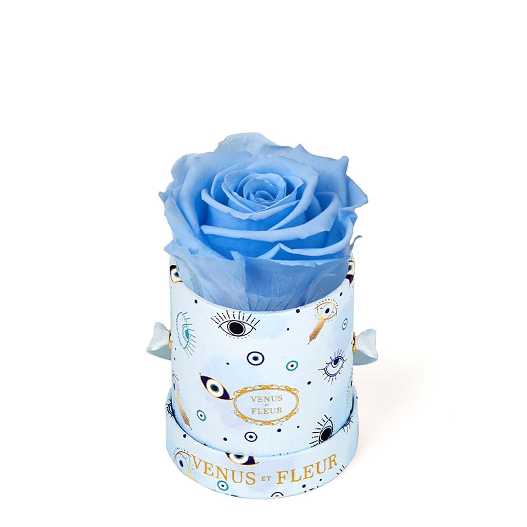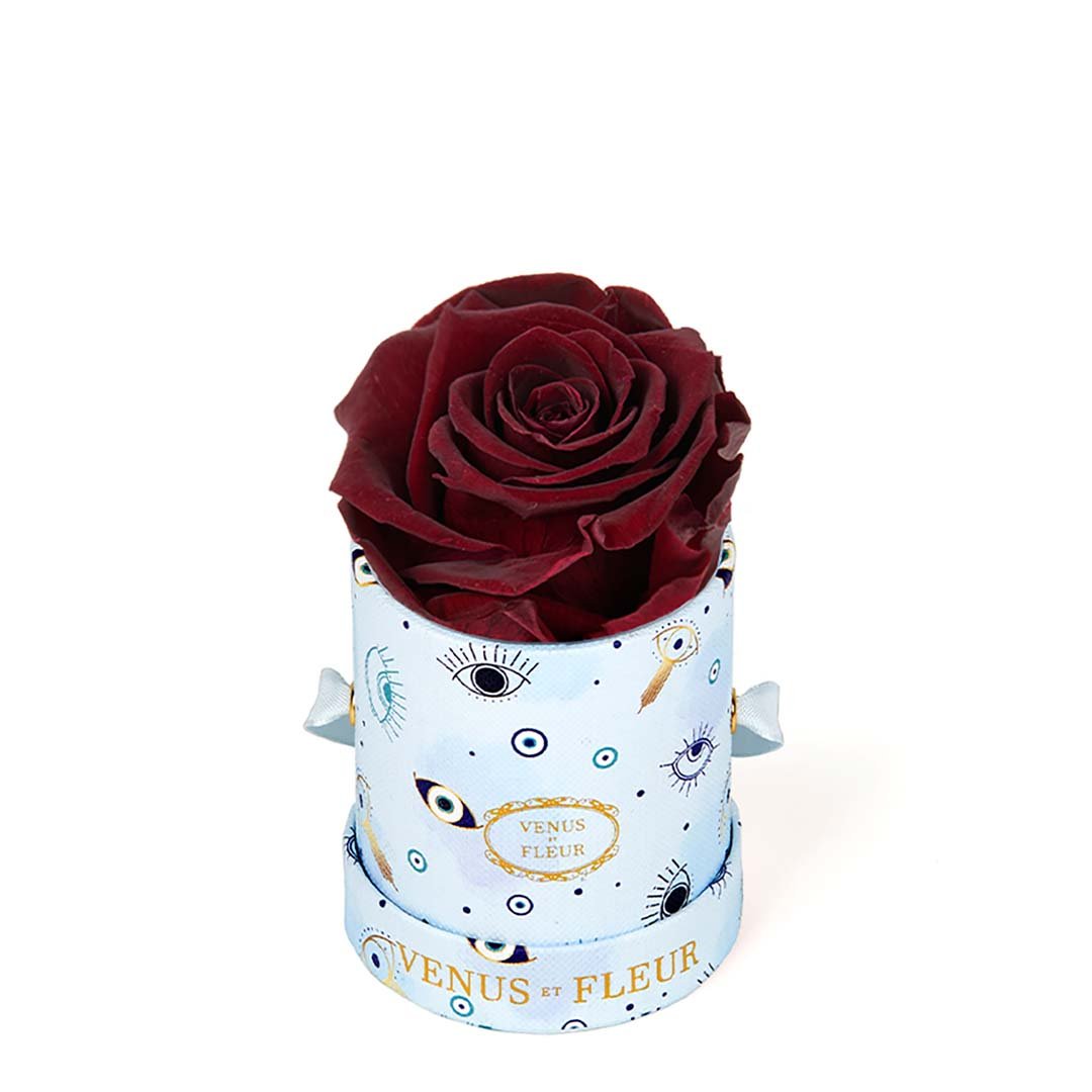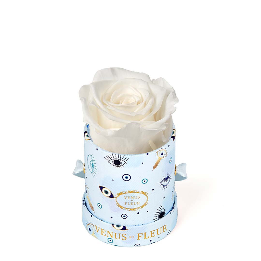 Our Le Mini arrangements feature a stunning, singular Eternity Rose®, set in our luxurious suede Parisian-hat box inspired round boxes. The Le Minis are ideal arrangements for elevating any small space, and serve as perfect gifts **Please note that variations will occur since all of our arrangements are uniquely handmade by our in-house designers.**